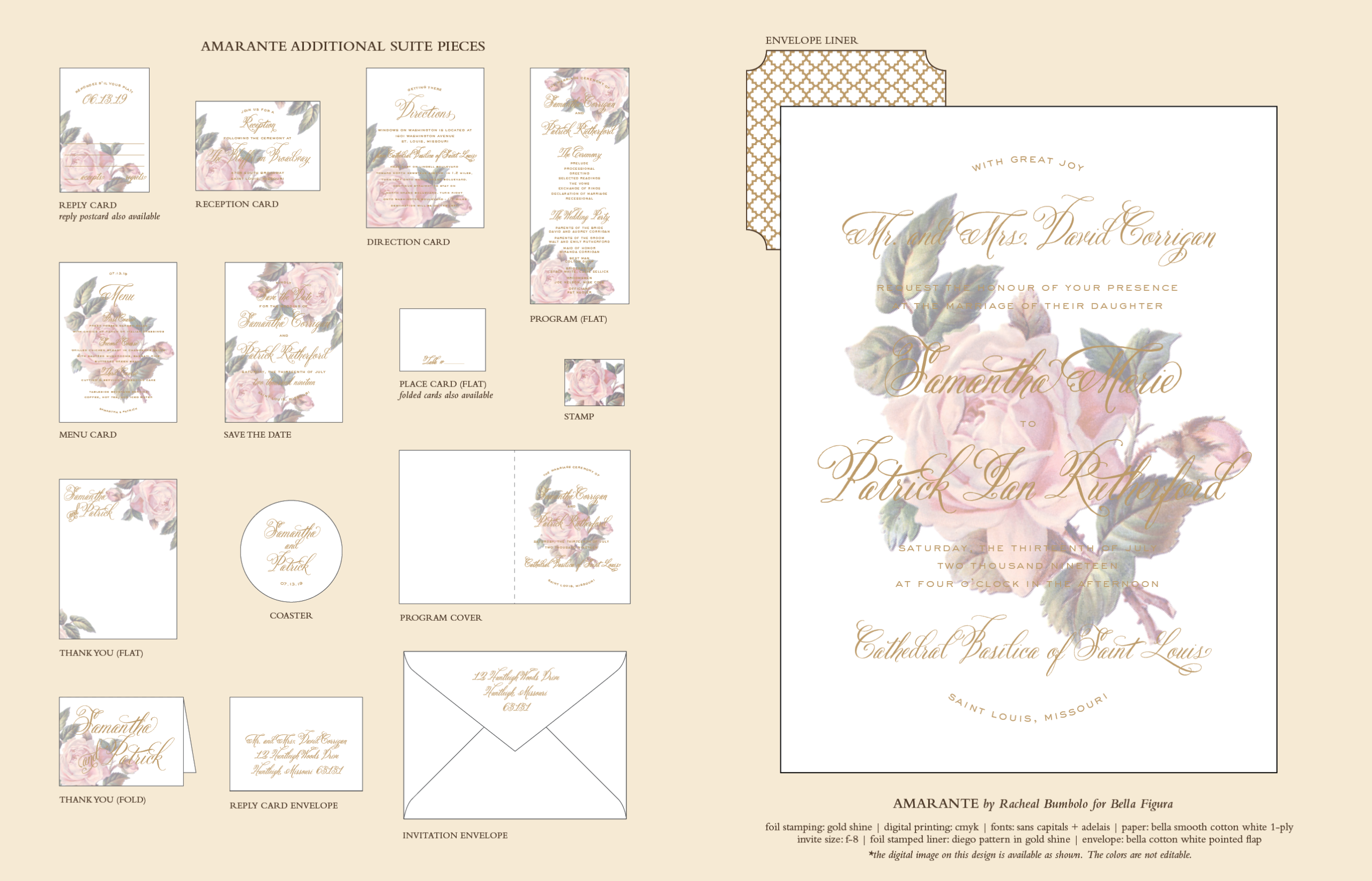 Wedding Invitations by Racheal Bumbolo for Bella Figurafoil stamping: gold shine | digital printing: cmyk | fonts: sans capitals + adelais | paper: bella smooth cotton white 1-ply | invite size: f-8 | foil stamped liner: diego pattern in gold shine | envelope: bella cotton white pointed flap