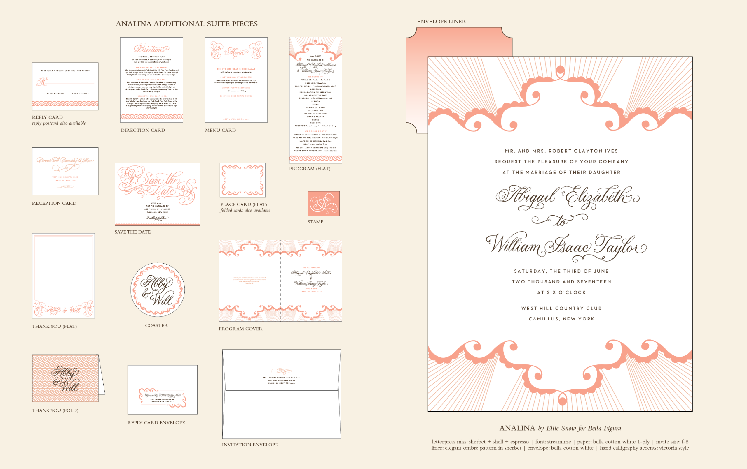 Wedding Invitations by Ellie Snow for Bella FiguraHopelessly chic and with a flair for elegance, Analina letterpress wedding invitations keep things fresh, worldly, and sophisticated. Graceful design and romantic typography make for an overall impression of globally-inspired elegance in this design from Ellie Snow.
