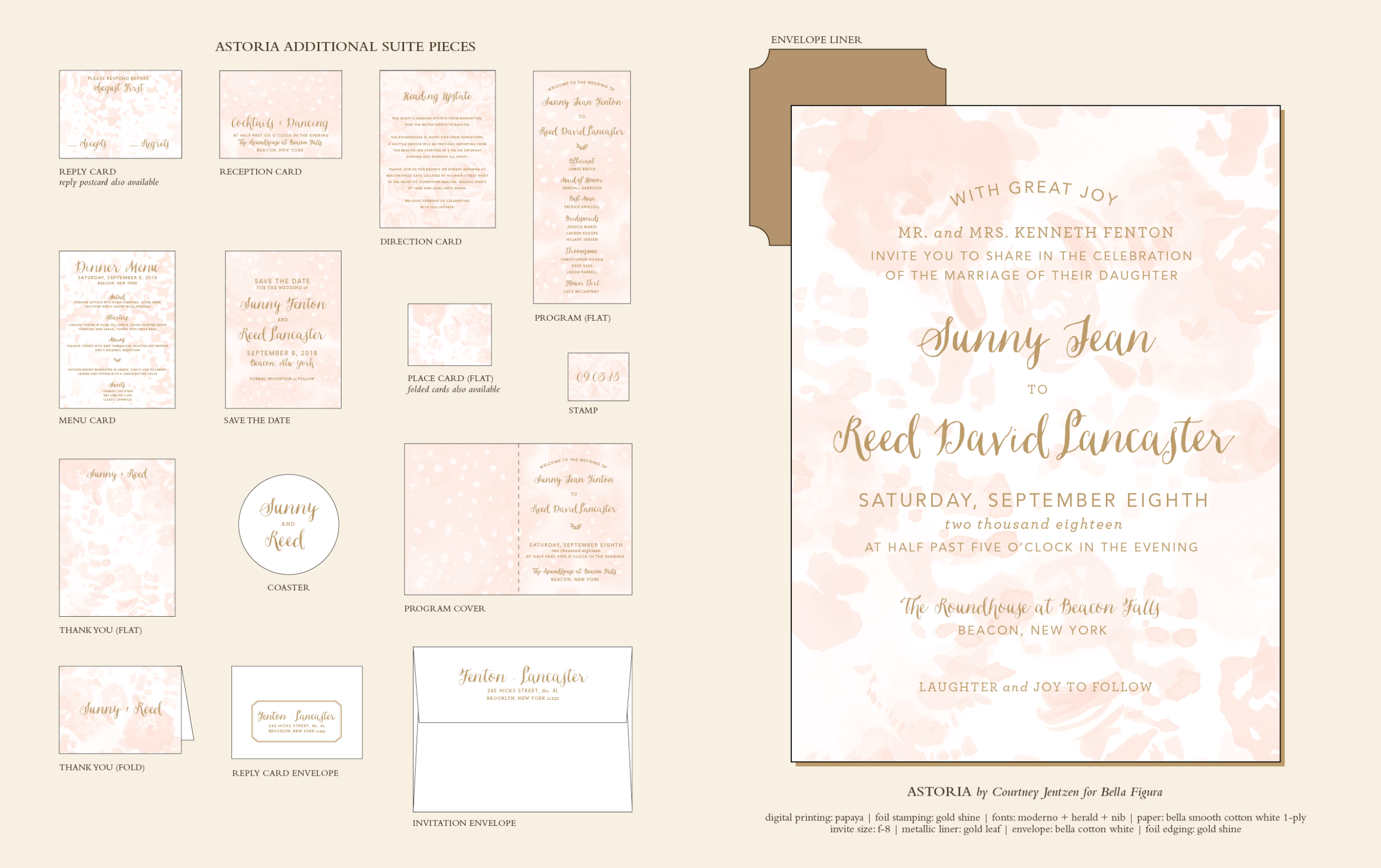 Wedding Invitations by Courtney Jentzen for Bella Figurafoil stamping: gold shine | digital ink: papaya | fonts: moderno + herald + nib | paper: bella smooth cotton white 1-ply | foil edging: gold shine | invite size: f-8 | metallic liner: gold leaf | envelope: bella cotton white