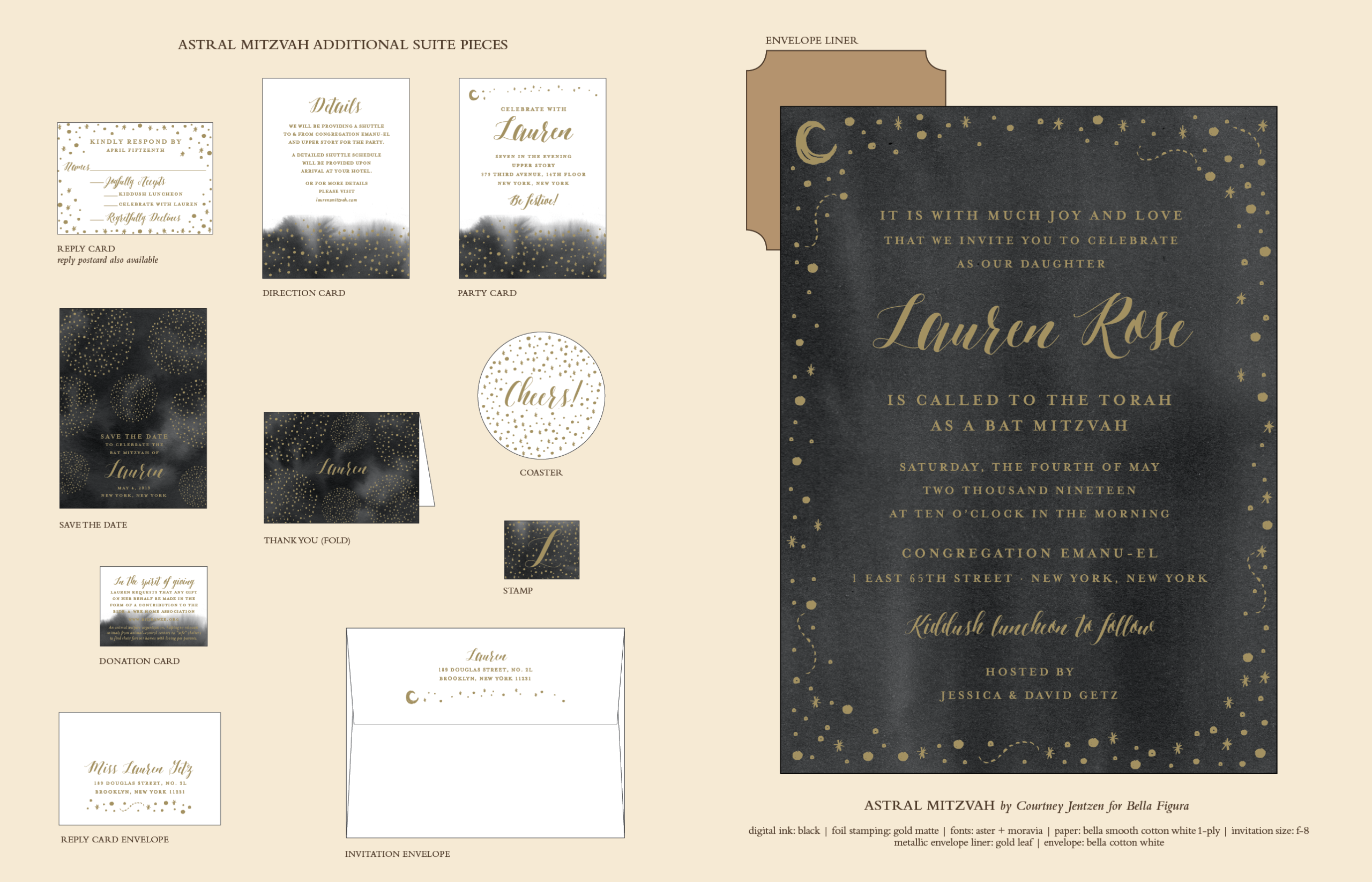 Mitzvah Invitations by Courtney Jentzen for Bella Figuradigital ink: black | foil stamping: gold matte | fonts: aster + moravia | paper: bella smooth cotton white 1-ply | invite size: f-8 | metallic envelope liner: gold leaf | envelope: bella cotton white