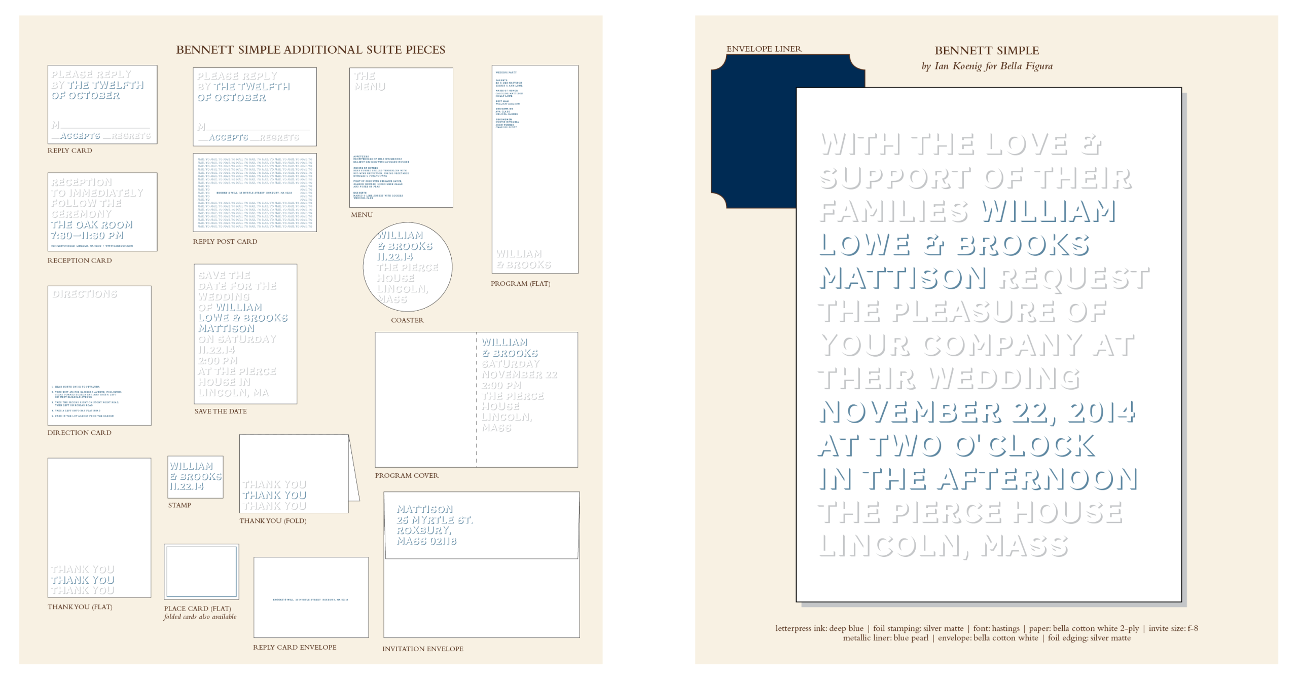 Wedding Invitations by Ian Koenig for Bella Figuraletterpress ink: deep blue | foil stamping: silver matte | font: hastings | paper: bella cotton white 2-ply | foil edging: silver matte | invite size: f-8 | metallic liner: blue pearl | envelope: bella cotton white