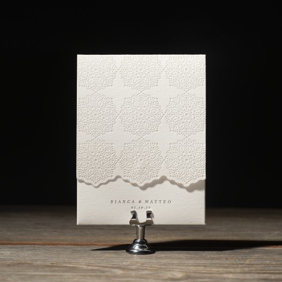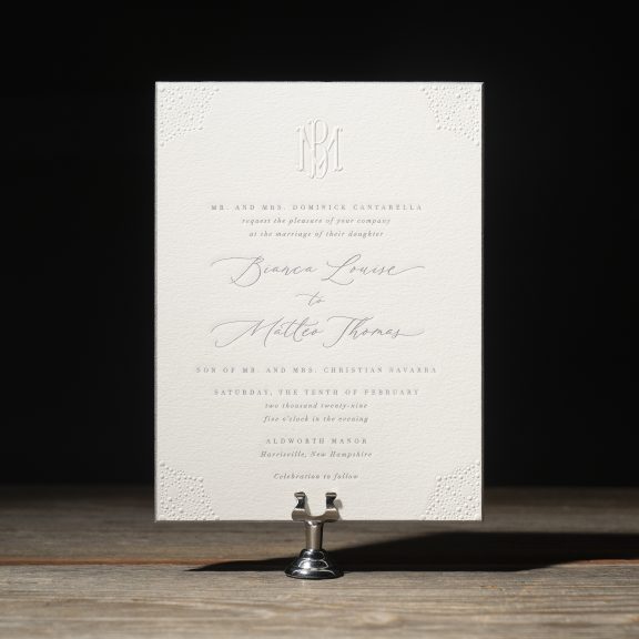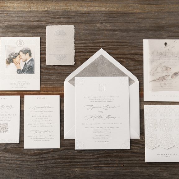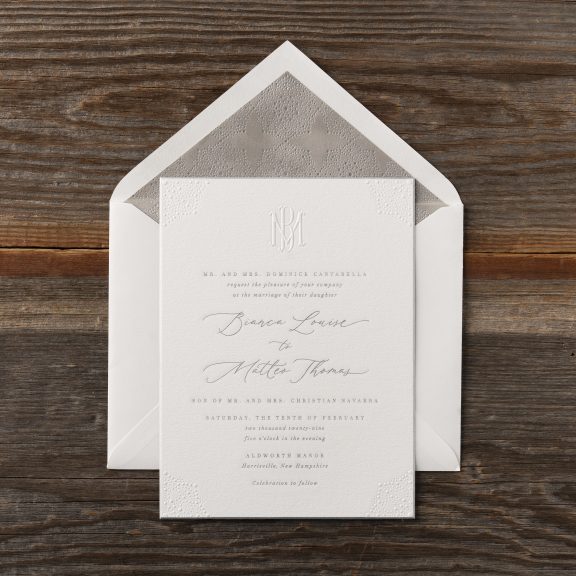 Wedding Invitations by Lindsy Talarico for Bella Figuraembossing: blind | engraving ink: metallic silver | fonts: besotted love + didot + totf monogram | paper: bella cotton white 2-ply | invite size: f-8 (tier 3) | bevel: 45° | edge paint: metallic silver | liner: bianca pattern in silver matte foil on dolphin velvet | envelope: bella cotton white pointed flap | digital addressing inks: clay + cmyk
