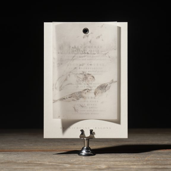 letterpress ink: clay (menu) | digital ink: clay (menu) + cmyk (overlay) | fonts: didot | papers: bella smooth cotton white duplexed 2-ply (menu) + 40# vellum (overlay) | card size: a-7 (tier 3) | overlay size: custom cut 4 x 6 (tier 2) | hole drill: 0.25 | grommet: silver