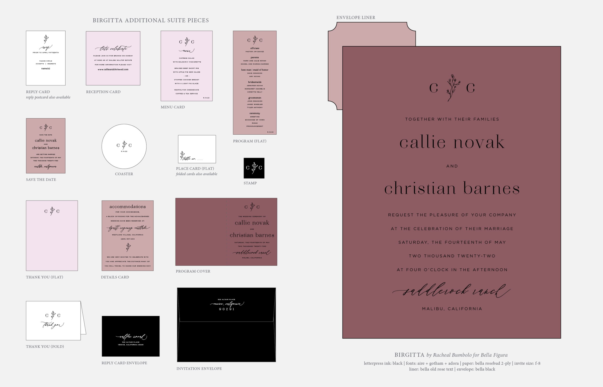 Retired Designs by Racheal Bumbolo for Bella Figuraletterpress ink: black | fonts: aire + gotham + adora | paper: bella rosebud (now mauve) 2-ply | invite size: f-8 | liner: bella old rose (now rose) text | envelope: bella black (now ultra black)