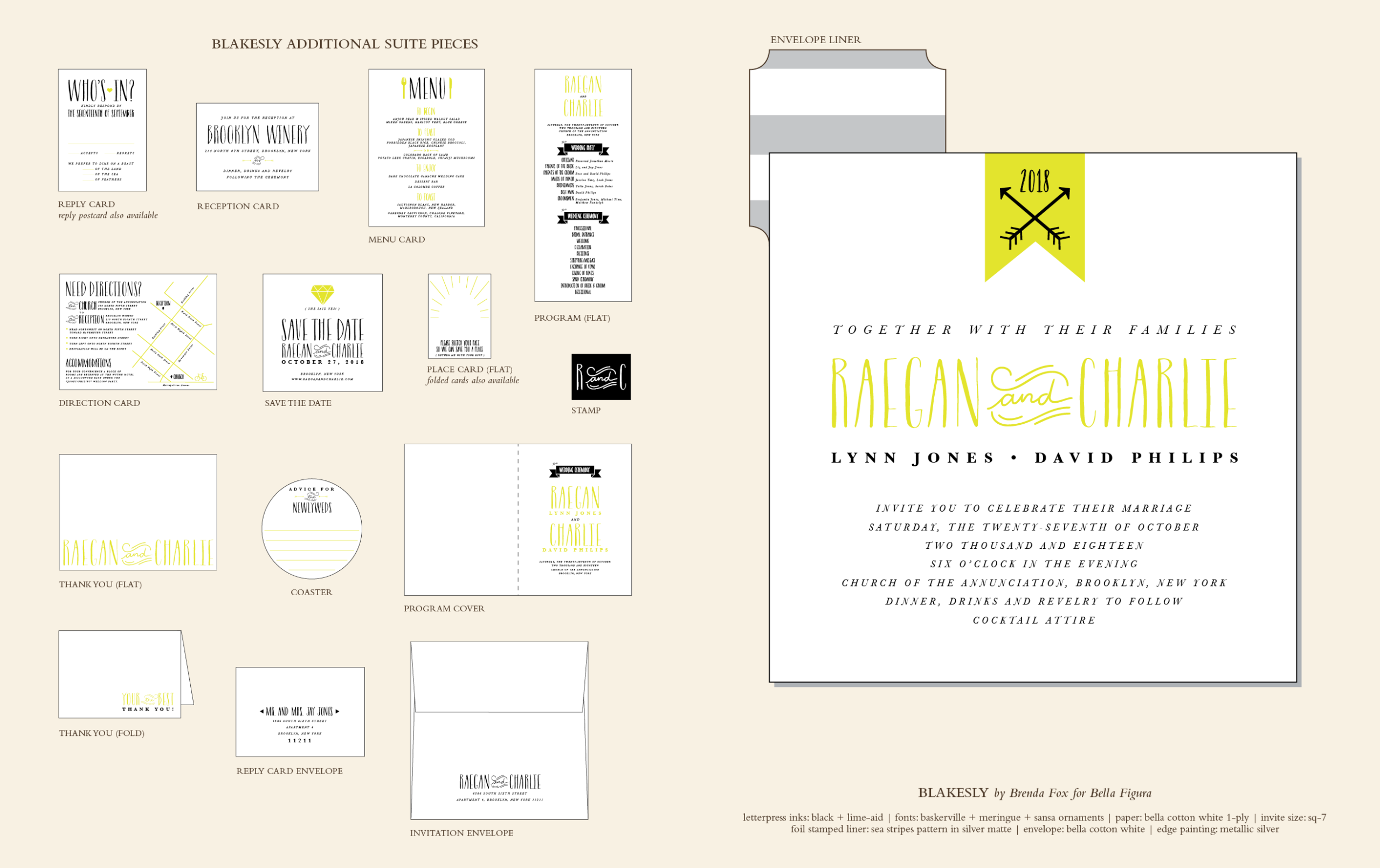 Wedding Invitations by Brenda Fox for Bella FiguraModern and bold, Blakesly letterpress wedding invitations are perfect for a fun-loving couple. Printed in a cool pairing of Black and Lime-Aid inks, these letterpress invitations are idealĀ for a wedding party complete with a photobooth, candy buffet, and with any luck, a fake mustache or two.