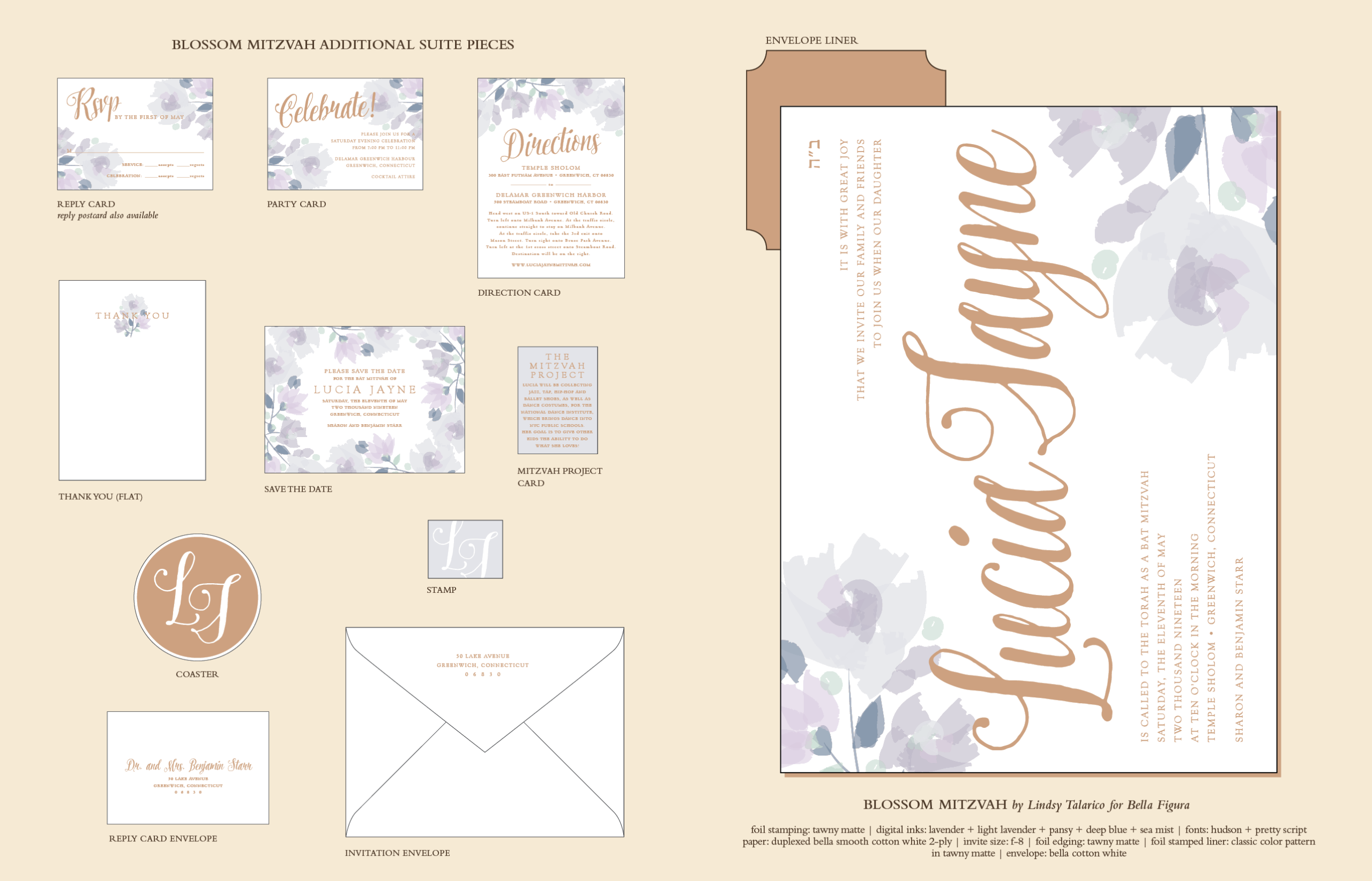 Mitzvah Invitations by Lindsy Talarico for Bella Figurafoil stamping: tawny matte | digital inks: lavender + light lavender + pansy + deep blue + sea mist | fonts: hudson + pretty script | paper: duplexed bella smooth cotton white 2-ply | invite size: f-8 | foil edging: tawny matte | foil stamped liner: classic color pattern in tawny matte | envelope: bella cotton white