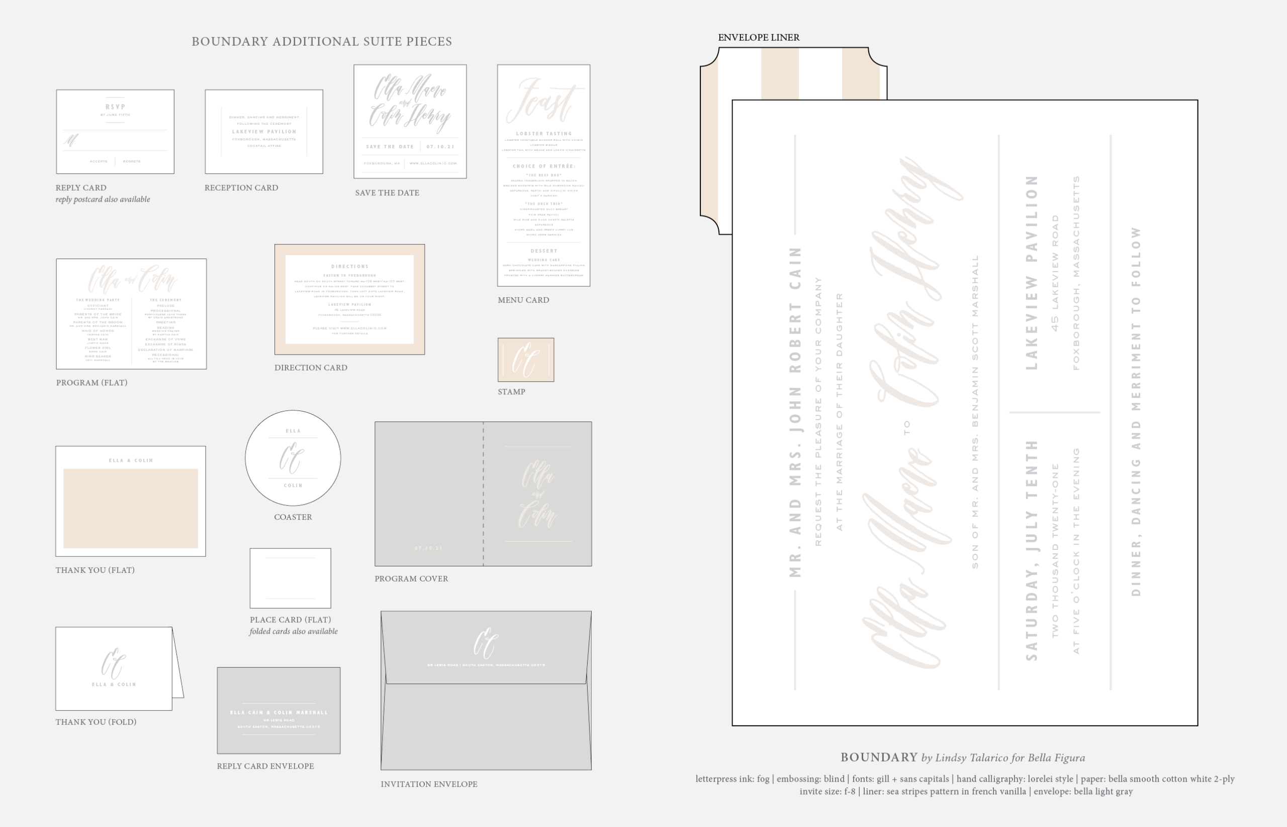 Retired Designs by Lindsy Talarico for Bella Figuraletterpress ink: fog | embossing: blind | fonts: gill + sans capitals | hand calligraphy: lorelei style by Virginia Lucas Hart | paper: bella smooth cotton white 2-ply | invite size: f-8 | liner: sea stripes pattern in french vanilla | envelope: bella light gray (now pebble)