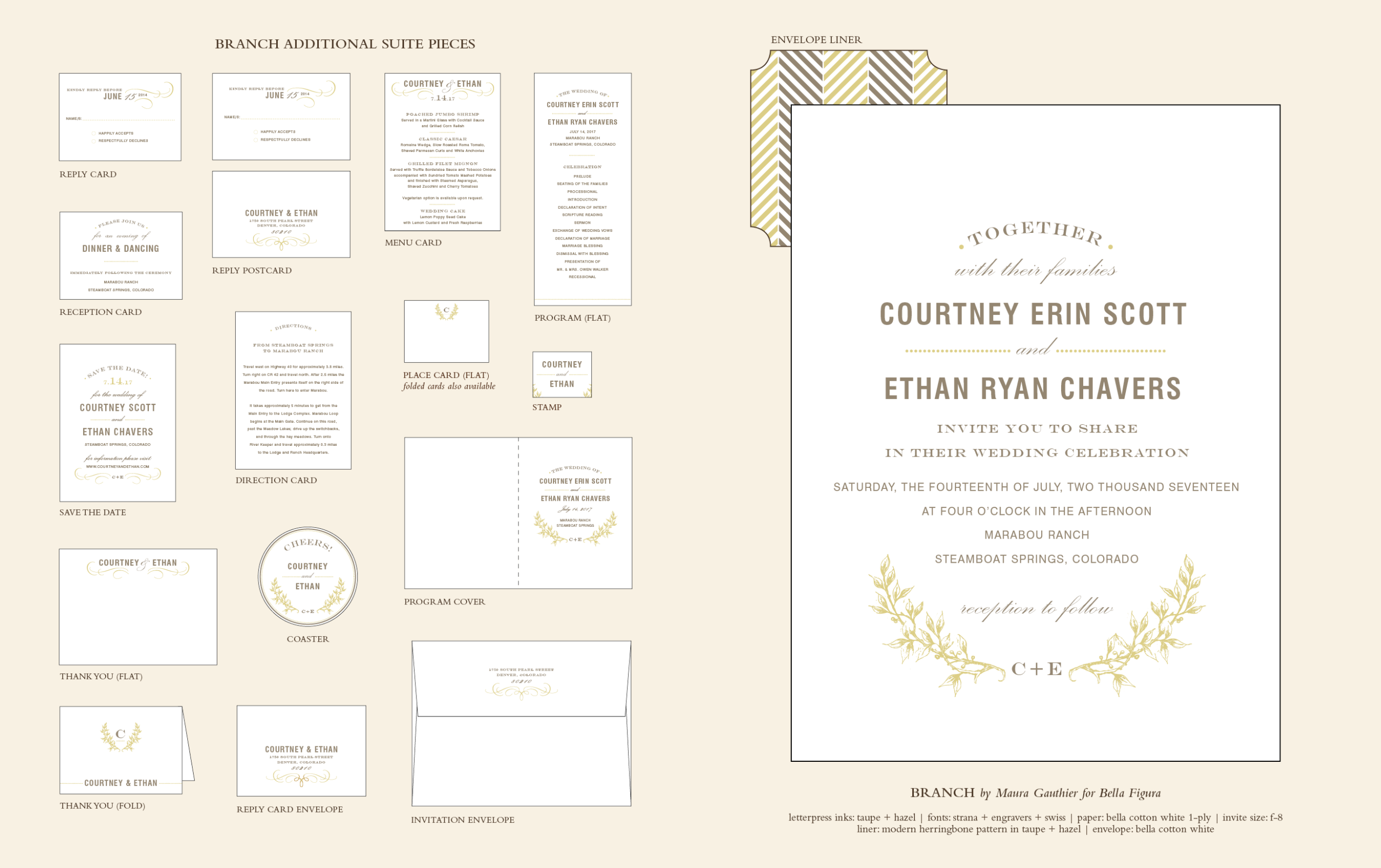 Branch by Maura Gauthier is the portrait of an eco friendly letterpress wedding invitation with rustic chic character. We picture a pretty barn wedding with earthy details and a hearty serving of farm fresh letterpress.