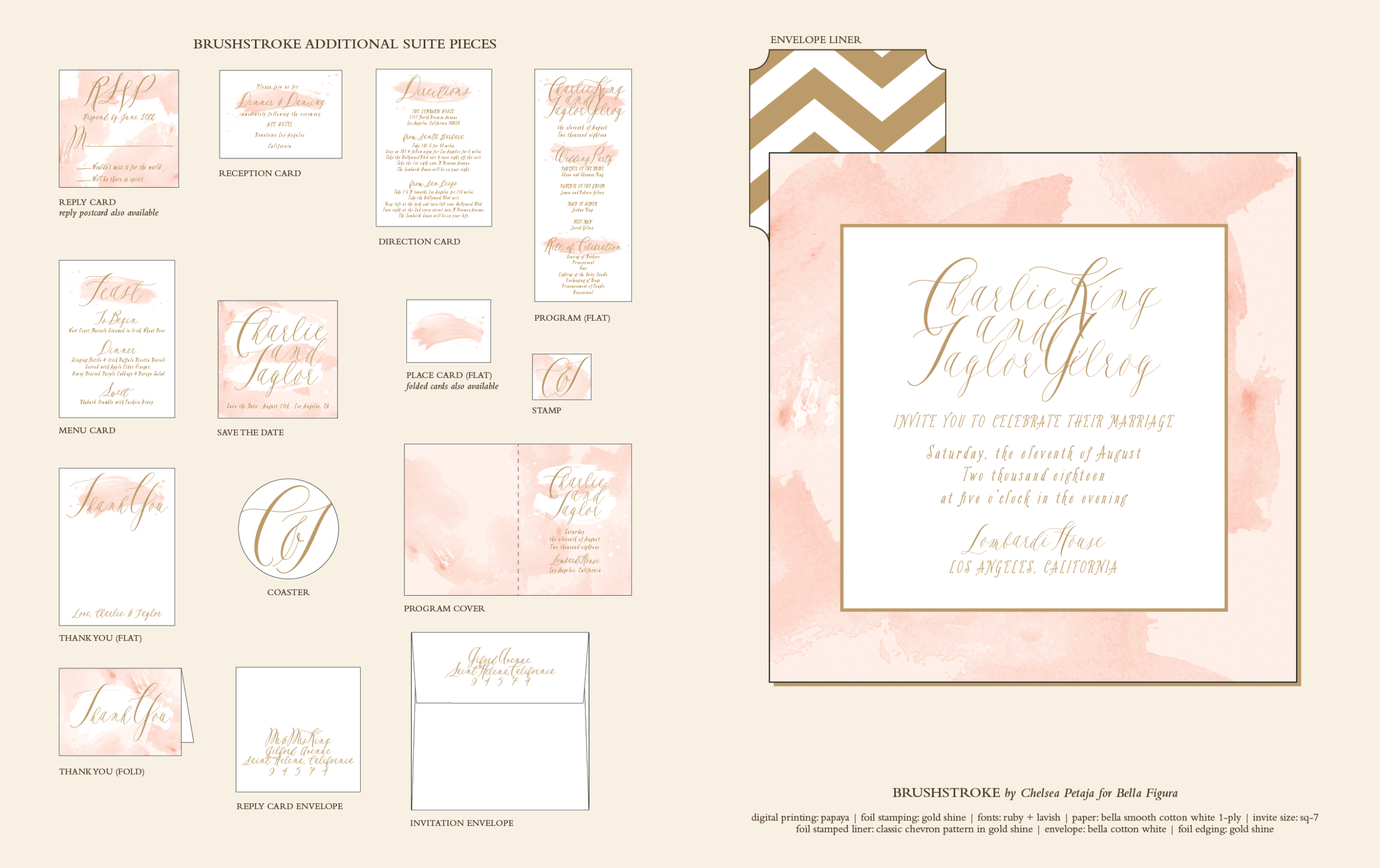 Wedding Invitations by Chelsea Petaja for Bella FiguraChelsea Petaja's Brushstroke wedding invitations are relaxed and unstuffy, evoking a feeling of seaside celebrations and casual, backyard gatherings. Bella Smooth Cotton paper is the perfect backdrop for Chelsea's watercolor artwork digitally printed in Papaya and accented with Gold Shine foil. A Classic Chevron foil stamped liner in Gold Shine adds modern drama to the suite.