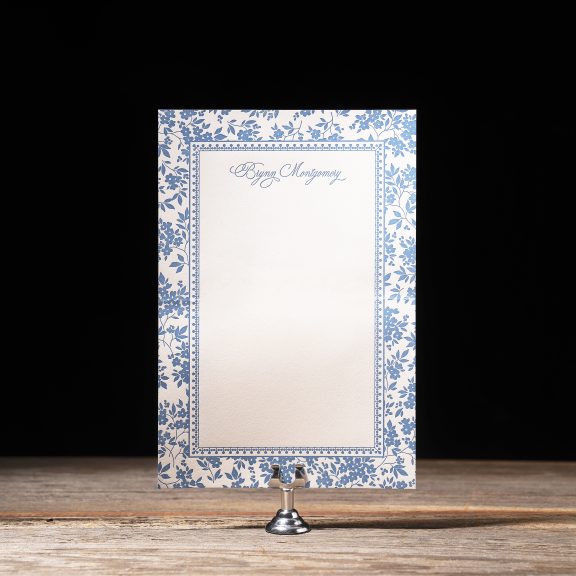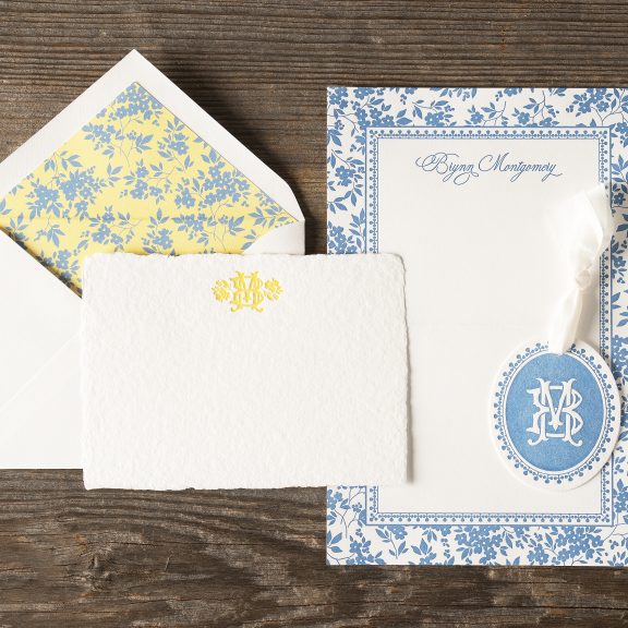 Social Stationery by Jessica Downs for Bella Figuraletterpress inks: lemon drop (card) + wedgewood (envelope) | fonts: monogram chic + miller headline | paper: bella handmade white | card size: a-6 (tier 2) | liner: brynn pattern in wedgewood + lemon drop | envelope: bella cotton white pointed flap
