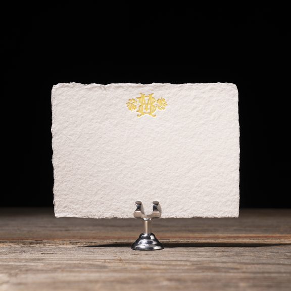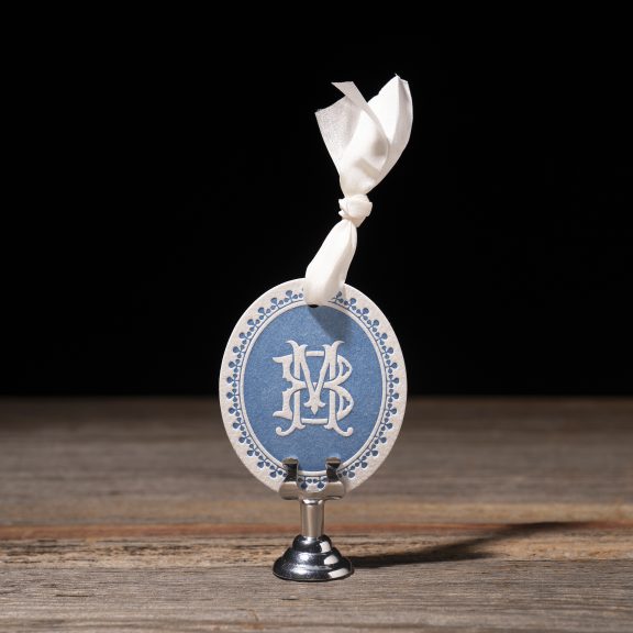 letterpress ink: wedgewood | font: monogram chic | paper: bella cotton white 1-ply | tag size: custom cut 2.5 x 3 (tier 1) | diecut style: cd-705 | hole drill: .1875 | silk ribbon: mother of pearl