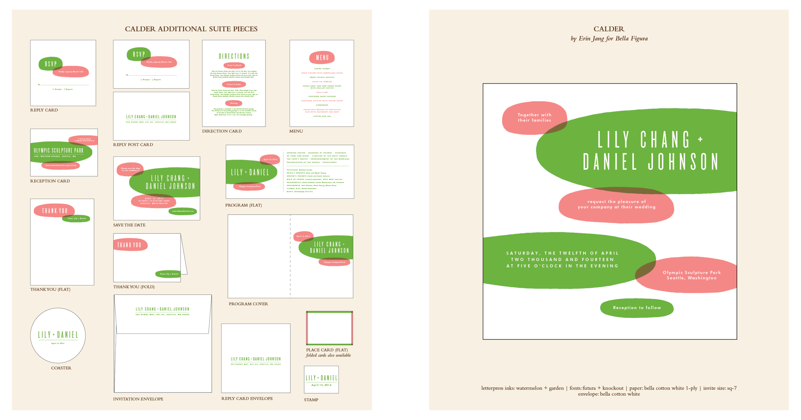 by Erin Jang for Bella FiguraPlayful colors swing merrily through the air without a worry in the world in this funky and eco friendly letterpress design from Erin Jang. A whimsical marriage of current letterpress invitation trends and fine art inspiration, Calder is a modern invitation with a heart full of pure joy.