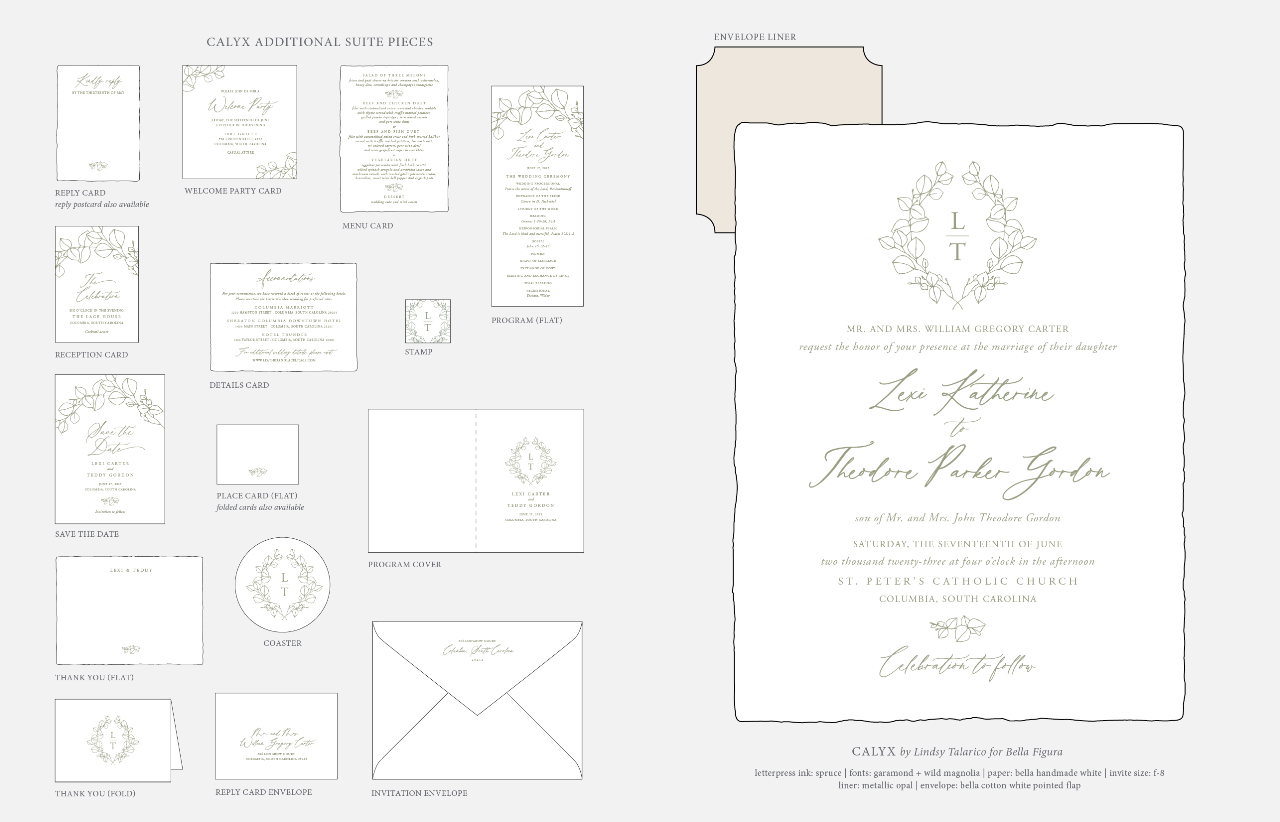 Retired Designs by Lindsy Talarico for Bella Figuraletterpress ink: spruce | fonts: garamond + wild magnolia | paper: bella handmade white | invite size: f-8 | liner: metallic opal | envelope: bella cotton white pointed flap