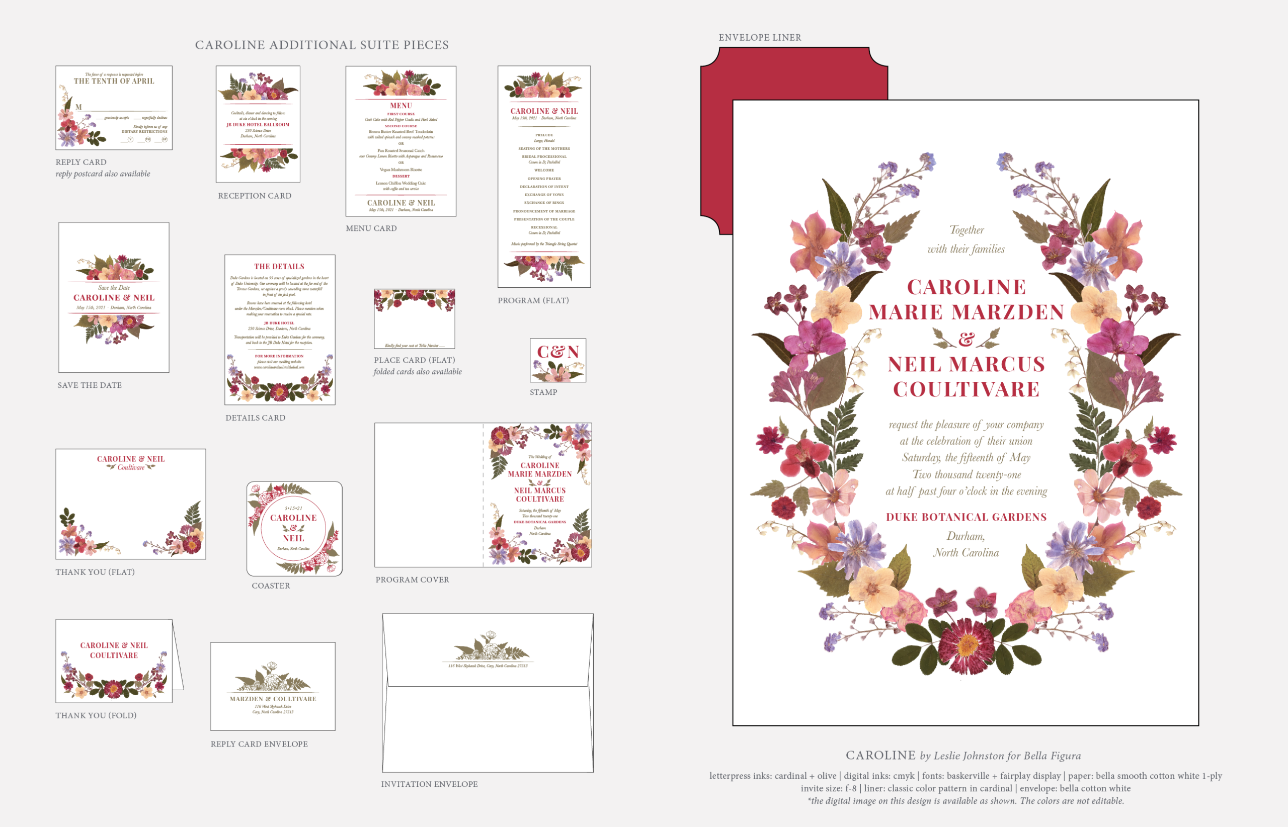 Retired Designs by Leslie Johnston for Bella Figuraletterpress inks: cardinal + olive | digital inks: cmyk | fonts: baskerville + fairplay display | paper: bella smooth cotton white 1-ply | invite size: f-8 | liner: classic color pattern in cardinal | envelope: bella cotton white
