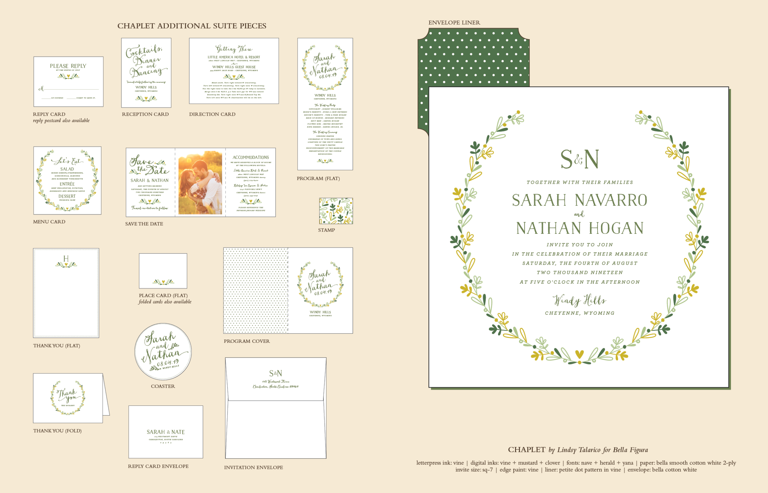 Retired Designs by Lindsy Talarico for Bella Figuraletterpress ink: vine | digital inks: vine + mustard + clover | fonts: nave + herald + yana | paper: bella smooth cotton white 2-ply | invite size: sq-7 | edge paint: vine | envelope liner: petite dot | pattern in vine | envelope: bella cotton white