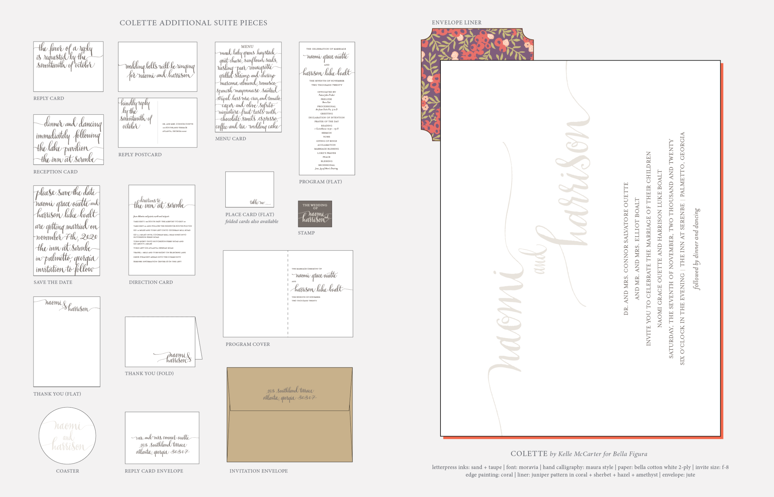Wedding Invitations by Kelle Anne McCarter for Bella FiguraA delicate letterpress vision of love, Colette letterpress wedding invitations from Kelle McCarter are gracefully modern and feature Kelle's exquisite hand calligraphy. Set the stage for your dazzling wedding day with these custom and purely fun letterpress invitations.