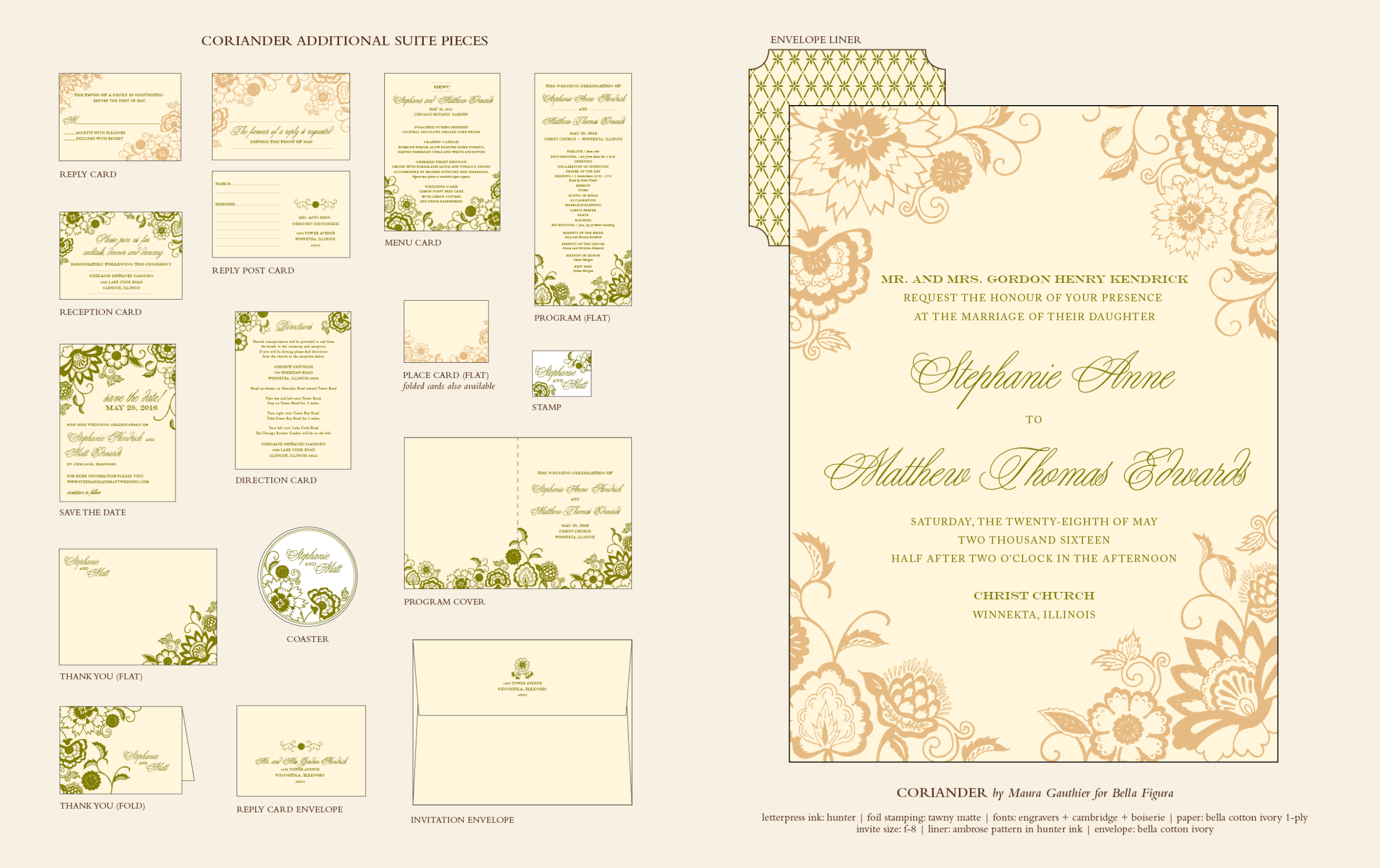 Wedding Invitations by Maura Gauthier for Bella FiguraThat devastatingly gorgeous letterpress wedding invitation you're admiring (the one with the romantic Victorian floral motifs) is one we call Coriander, and was designed by the greatly talented Maura Gauthier. Glamorous blooms give it a sublime sense of vintage appeal that fits right in with the most elegant of weddings.