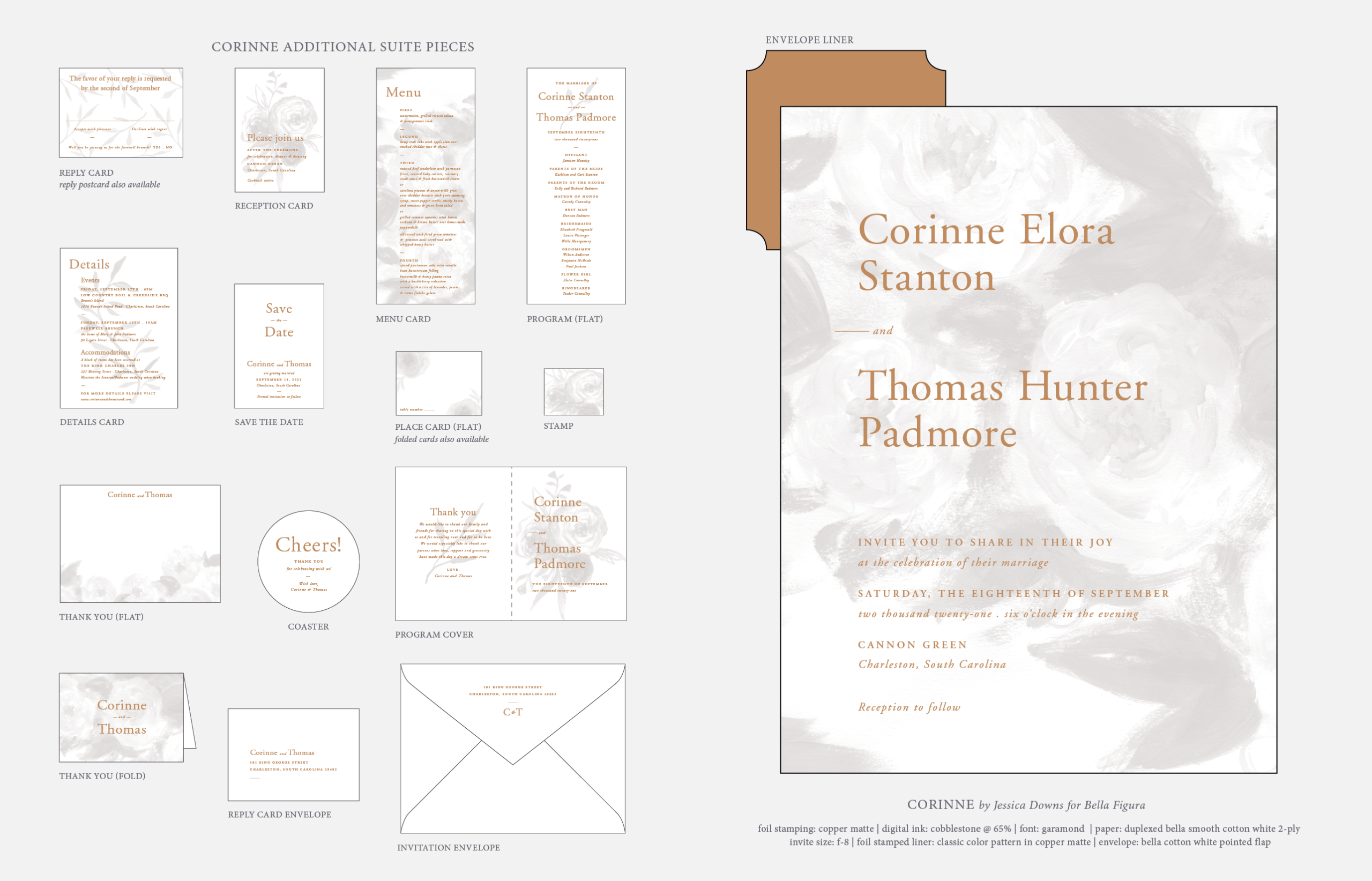 Retired Designs by Jessica Downs for Bella Figurafoil stamping: copper matte | digital ink: cobblestone @ 65% | font: garamond | paper: duplexed bella smooth cotton white 2-ply | invite size: f-8 | foil stamped liner: classic color pattern in copper matte | envelope: bella cotton white pointed flap
