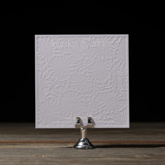 Save the Dates by Katie Magee for Bella Figuraletterpress ink: blind deboss | foil stamping: white matte | fonts: tan - waltzing mathilde + bergen + pink champagne | paper: lilac 2-ply | card size: sq-5 (tier 1) | edge painting: verdigris