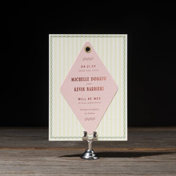 Save the Dates by Racheal Bumbolo for Bella Figuraletterpress ink: mint + leaf (card) | foil stamping: claret shine (tag) | fonts: gotham light + gotham light italic + makawao + road runner | paper: bella smooth cotton white 1-ply (card) + metallic rose quartz 1-ply (tag) | card size: a-6 (tier 2) | tag size: 3.75 x 5.5 (tier 1) | diecut style: bf-123 | grommet: gold | hole drill: .25