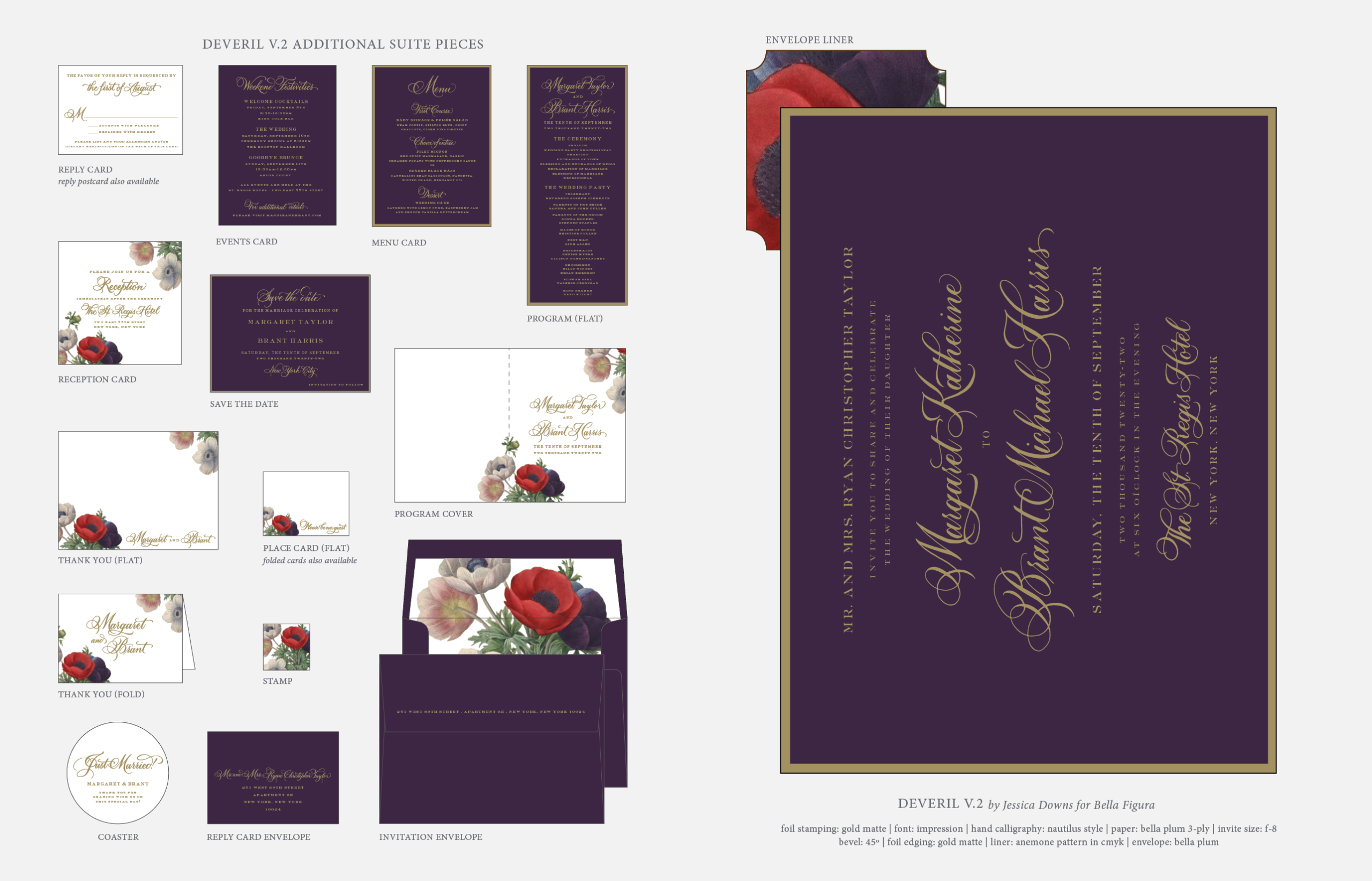 Retired Designs by Jessica Downs for Bella Figurafoil stamping: gold matte | font: impression | hand calligraphy: this style is no longer available | paper: bella plum (now eggplant) 3-ply | invite size: f-8 | bevel: 45ยบ | foil edging: gold matte | liner: anemone pattern in cmyk | envelope: bella plum (now eggplant)