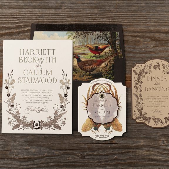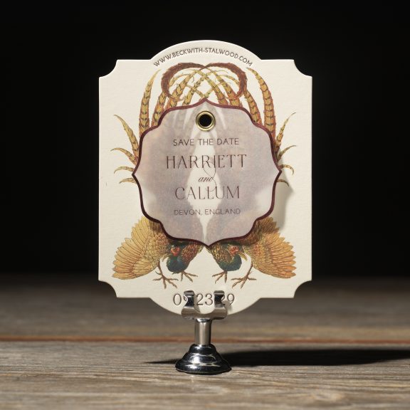 Save the Dates by Leslie Johnston for Bella Figuraletterpress ink: ganache (card) | foil stamping: chestnut shine (tag) | digital ink: cmyk (card) | fonts: astralaga light + josefin sans regular + ecatherina script | papers: bella smooth cotton ivory 1-ply (card) + 40# vellum (tag) | card size: a-2 (tier 1) | card diecut style: bf-139 | grommet: gold | hole drill: .25 | tag size: custom cut 3 x 3 (tier 1) | tag diecut stye: cd-151