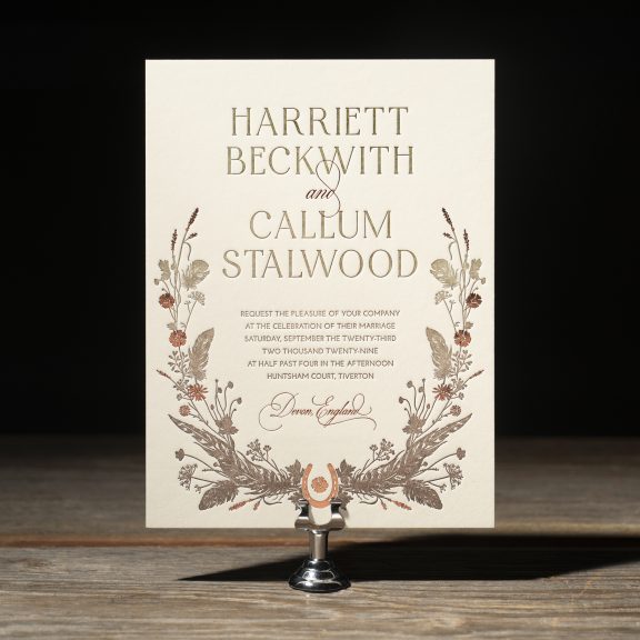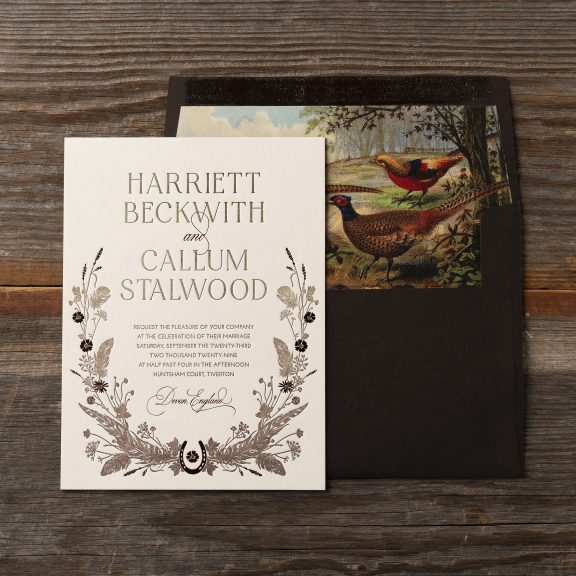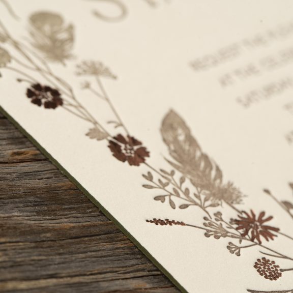 Wedding Invitations by Leslie Johnston for Bella Figuraletterpress inks: hunter + ganache ombre | foil stamping: chestnut shine (invitation + envelope) | fonts: astralaga light + josefin sans regular + ecatherina script | paper: bella smooth cotton ivory 2-ply | invite size: f-8 (tier 3) | edge painting: hunter + ganache ombre | liner: devonshire pattern in cmyk | envelope: walnut | digital addressing ink: ivory
