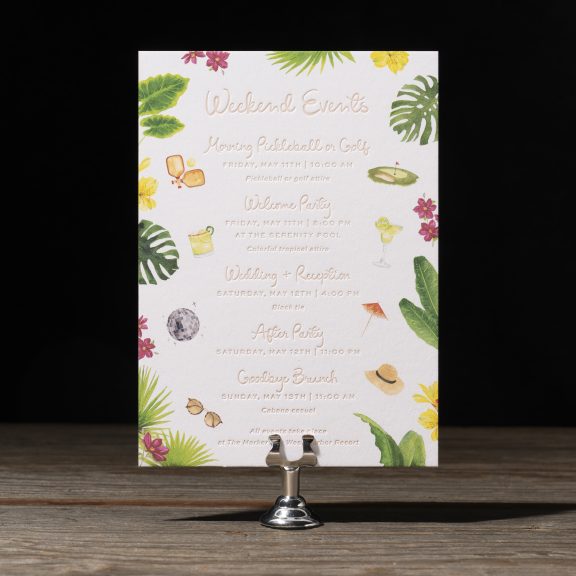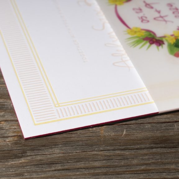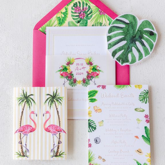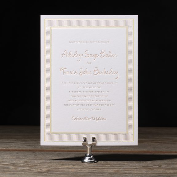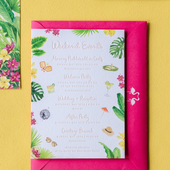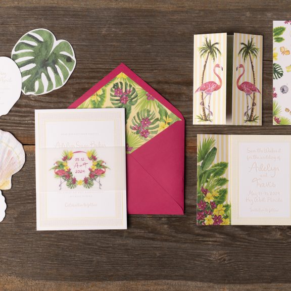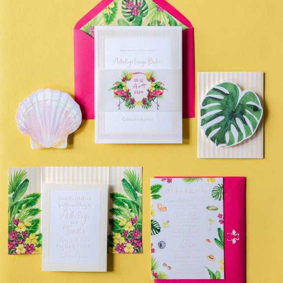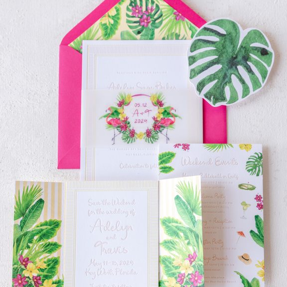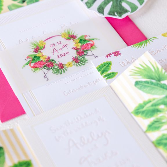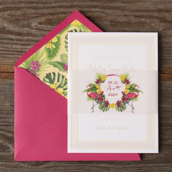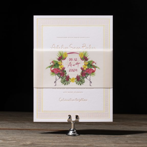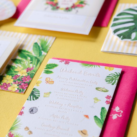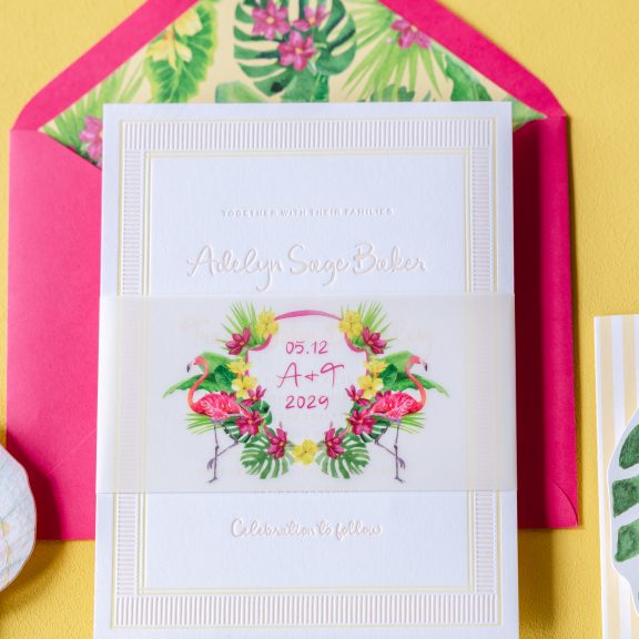Wedding Invitations by Jessica Downs for Bella Figuraletterpress inks: bellini + lemon drop | fonts: eternal blossom + sweet sans | papers: bella smooth cotton bright white duplexed 2-ply (card) + 40# vellum (belly band) | invite size: f-8 (tier 3) | belly band size: custom cut 3 x 13.25 flat, 3 x 6.24 assembled | edge painting: punch | liner: duval v.2 palms pattern in lemon drop + cmyk | custom converted envelope: punch text pointed flap | digital addressing ink: white