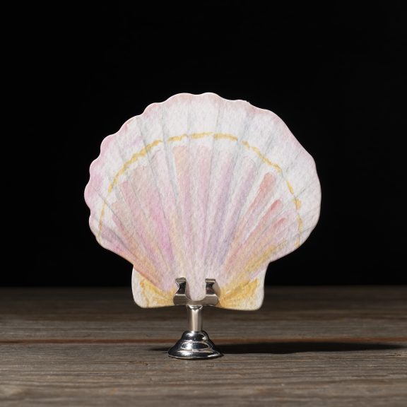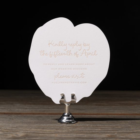 letterpress ink: bellini (back) | digital ink: cmyk (front) | font: eternal blossom + sweet sans | paper: bella smooth cotton bright white duplexed 2-ply | card size: custom cut 4.69 x 4.3 (tier 1) | diecut style: bf-145