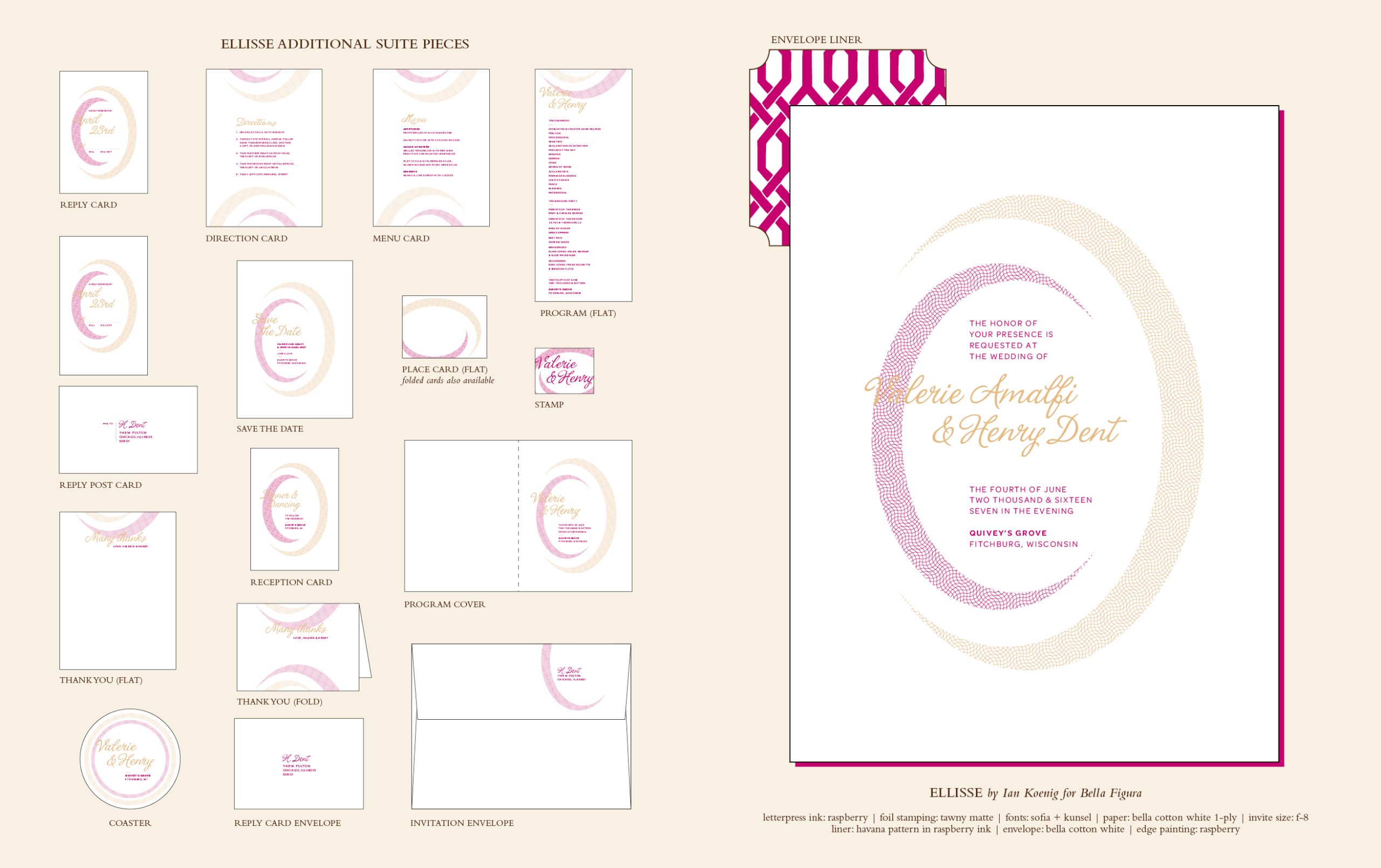 by Ian Koenig for Bella FiguraA duo of rambunctious curvilinear patterns embrace one another tenderly in this bold and modern letterpress wedding invitation from designer Ian Koenig. Ellisse is a contemporary synthesis of subtlety and adventurousness.