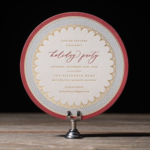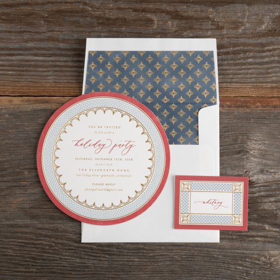 Holiday Cards by Lindsy Talarico for Bella Figurafoil stamping: gold matte | letterpress inks: deep red + chambray | fonts: gathering script + mrs eaves | paper: bella smooth cotton white 2-ply | card size: 6.25" circle (tier 2) | diecut style: bp-9 | liner: ellsworth pattern in gold matte on french blue velvet | envelope: bella cotton white | digital addressing ink: deep red