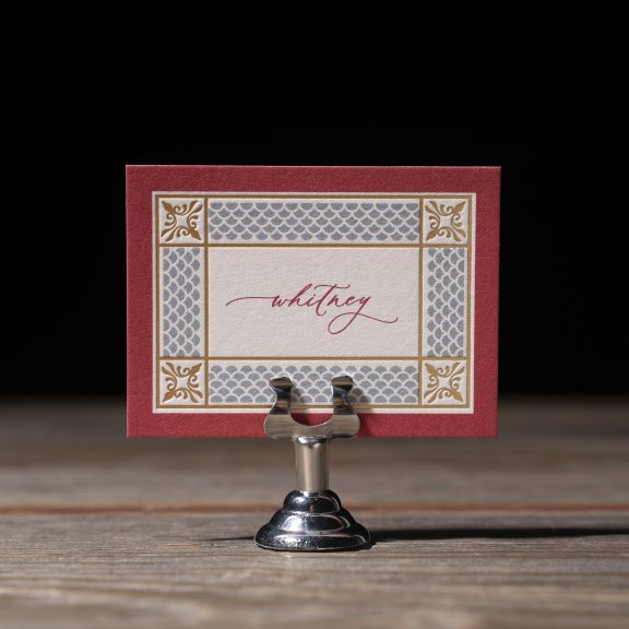 foil stamping: gold matte foil | digital inks: deep red + chambray | fonts: gathering script | paper: bella smooth cotton white 1-ply | card size: #17 (tier 1)
