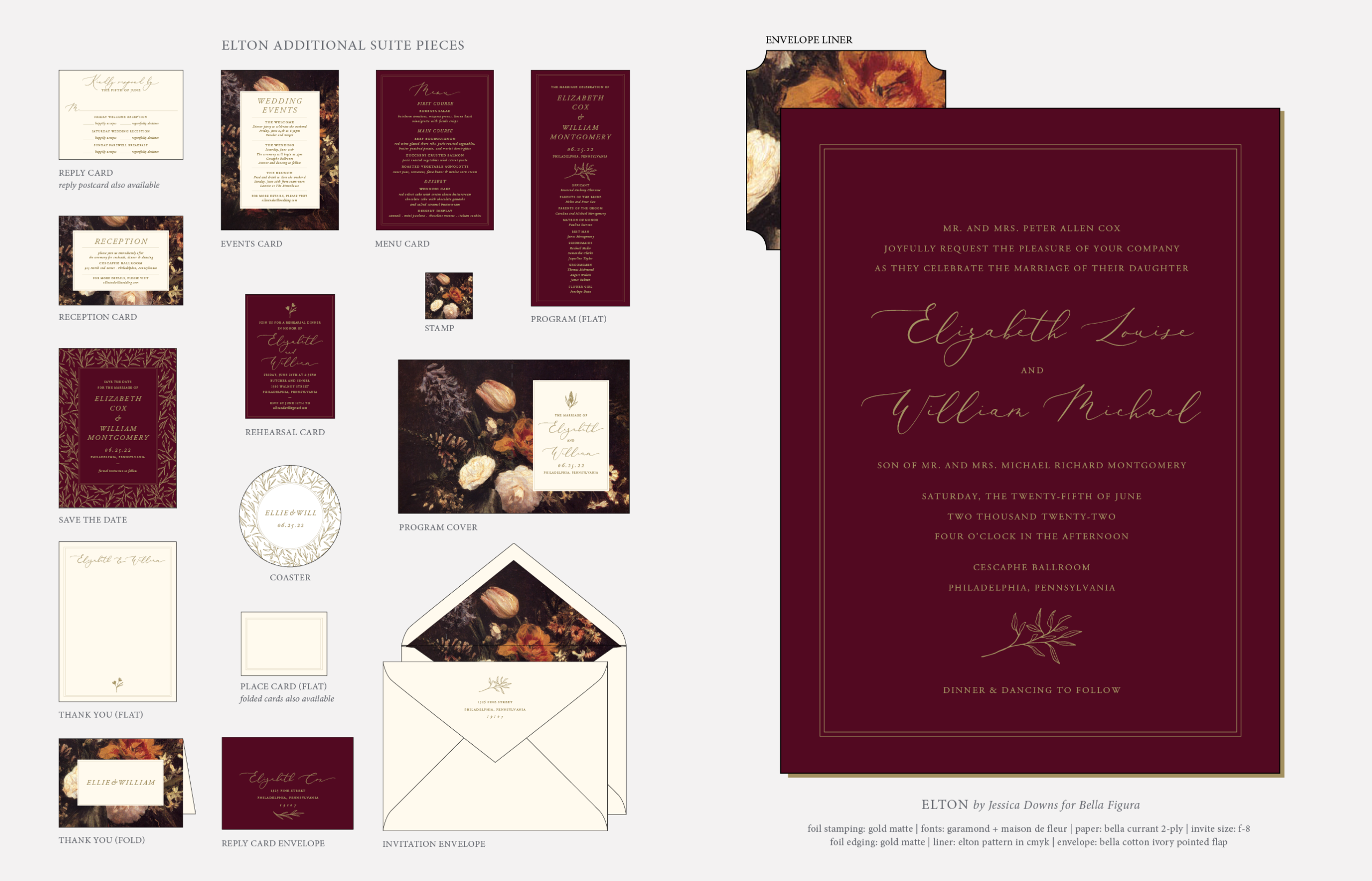 Retired Designs by Jessica Downs for Bella Figurafoil stamping: gold matte | fonts: garamond + maison de fleur | paper: bella currant (now bordeaux) 2-ply | invite size: f-8 | foil edging: gold matte | liner: elton pattern in cmyk | envelope: bella cotton ivory pointed flap