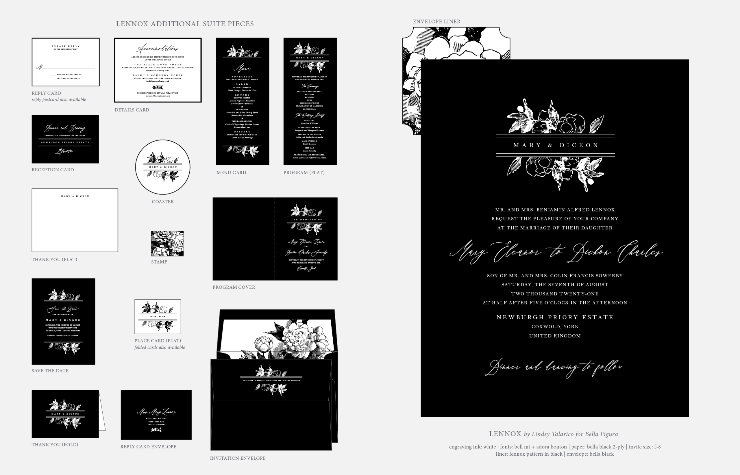 Retired Designs by Lindsy Talarico for Bella Figuraengraving ink: white | fonts: bell mt + adora bouton | paper: bella black (now ultra black) 2-ply | invite size: f-8 | diecut: lincoln style | liner: lennox pattern in black | envelope: bella black (now ultra black)