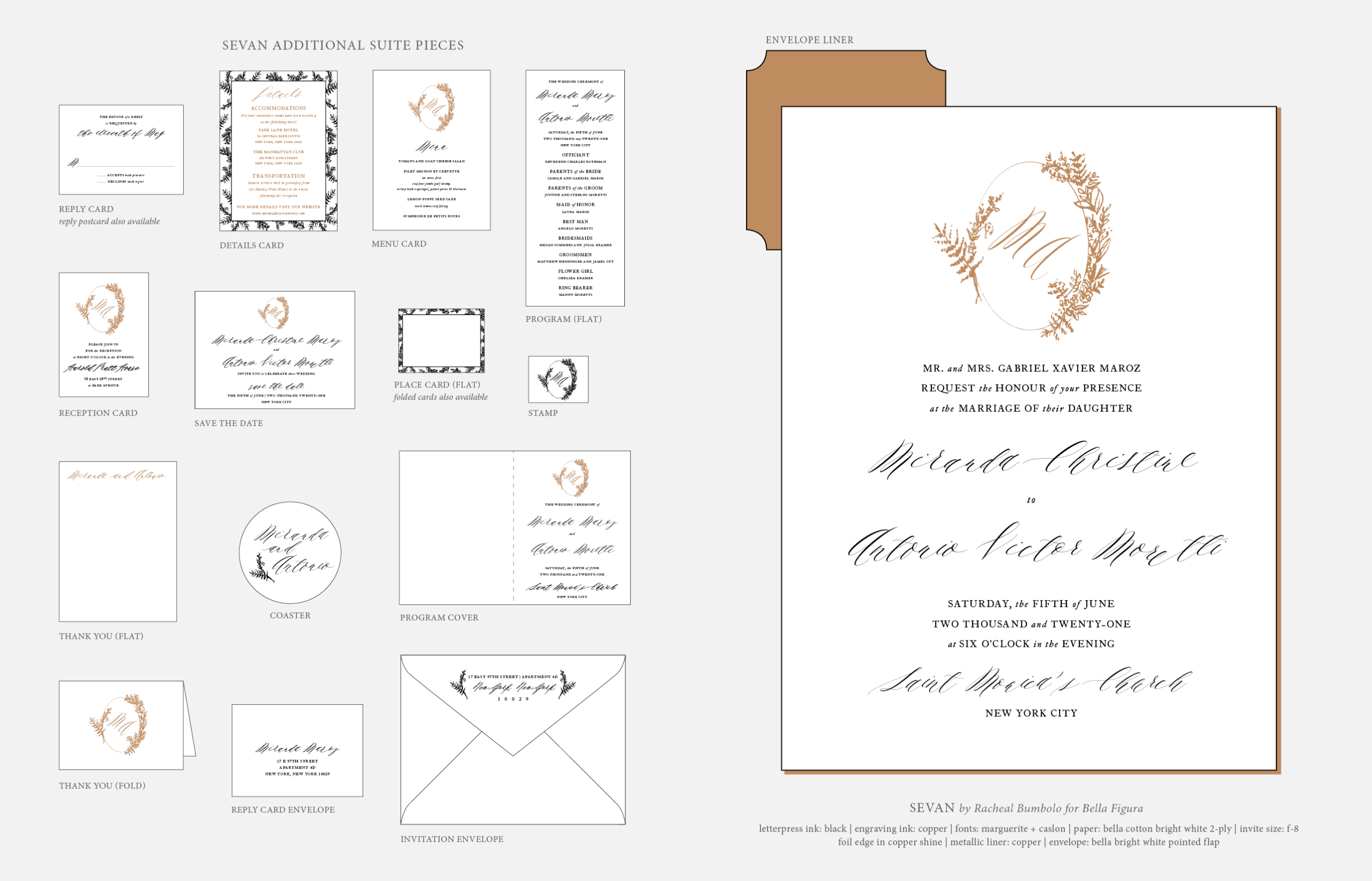 Retired Designs by Racheal Bumbolo for Bella Figuraletterpress ink: black | engraving ink: copper | fonts: marguerite + caslon | paper: bella cotton bright white 2-ply | invite size: f-8 | foil edge in copper shine | metallic liner: copper | envelope: bella bright white pointed flap