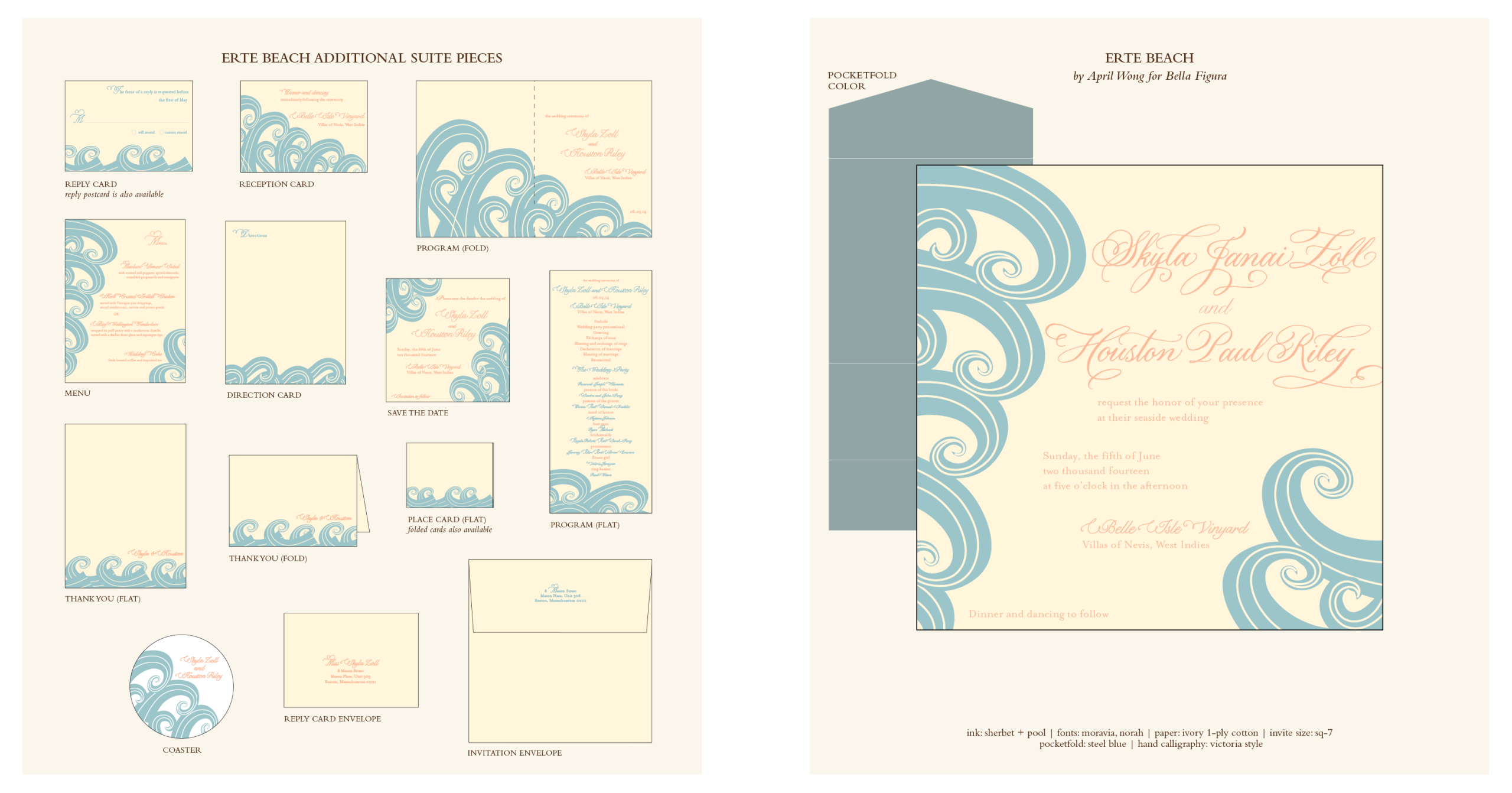 Wedding Invitations by April Wong for Bella FiguraModern and vibrant letterpress wedding invitations with notes of seaside joy, Erte Beach is funky wedding glamor - perfect for a indie chic wedding under the summer sun.