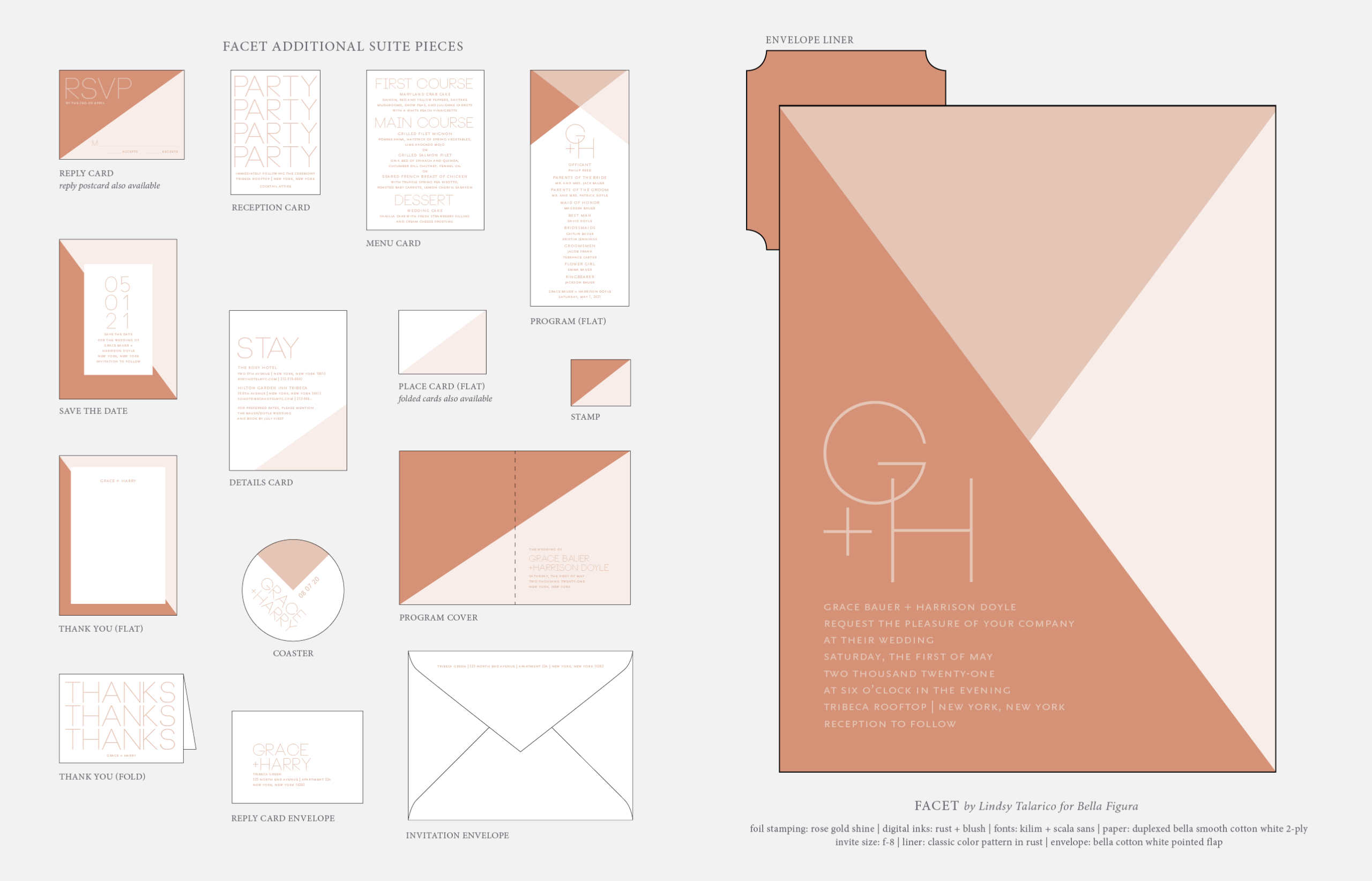 Retired Designs by Lindsy Talarico for Bella Figurafoil stamping: rose gold shine | digital inks: rust + blush | fonts: kilim + scala sans | paper: duplexed bella smooth cotton white 2-ply | invite size: f-8 | liner: classic color pattern in rust | envelope: bella cotton white pointed flap
