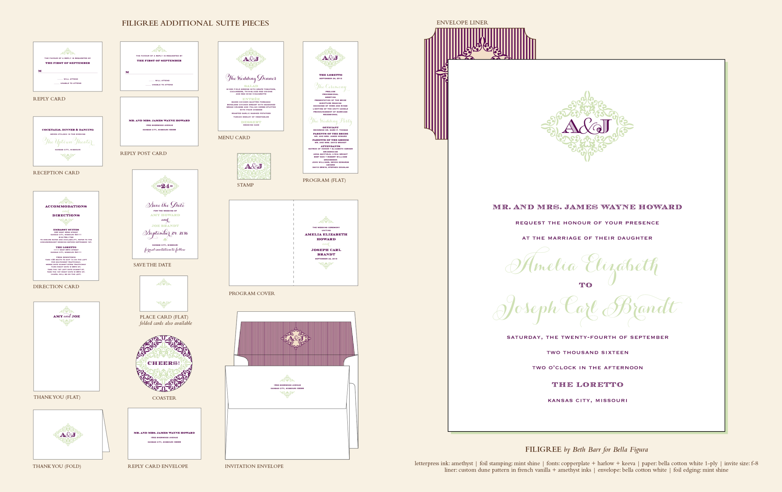 by Beth Barr for Bella FiguraClassic style, whispers of luxury, captivating to the last detail—Filigree is true letterpress invitation brilliance from designer Beth Barr. A beautiful yet simple declaration of formal elegance.
