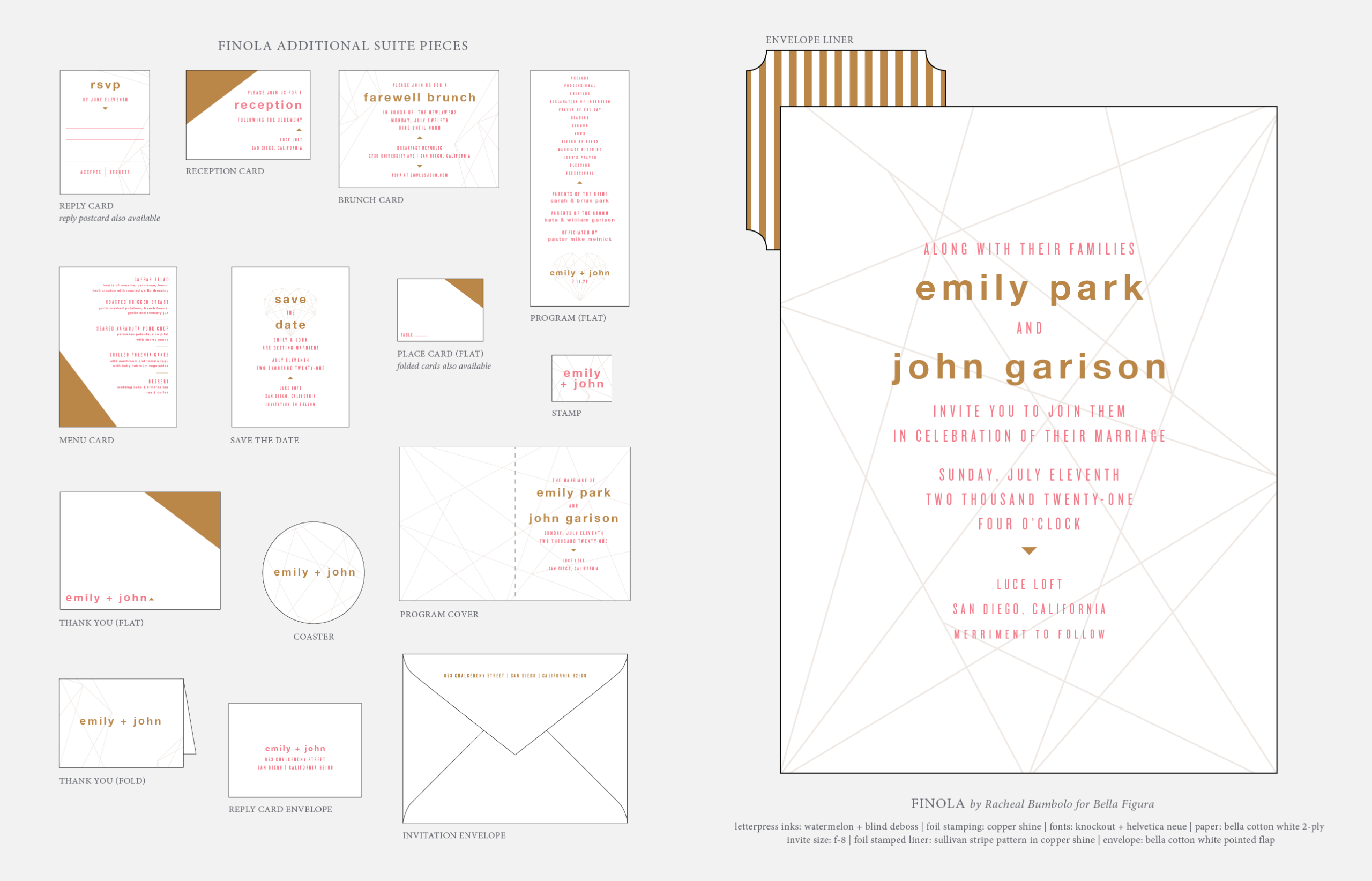 Retired Designs by Racheal Bumbolo for Bella Figuraletterpress inks: watermelon + blind deboss | foil stamping: copper shine | fonts: knockout + helvetica neue | paper: bella cotton white 2-ply | invite size: f-8 | foil stamped liner: sullivan stripe pattern in copper shine | envelope: bella cotton white pointed flap