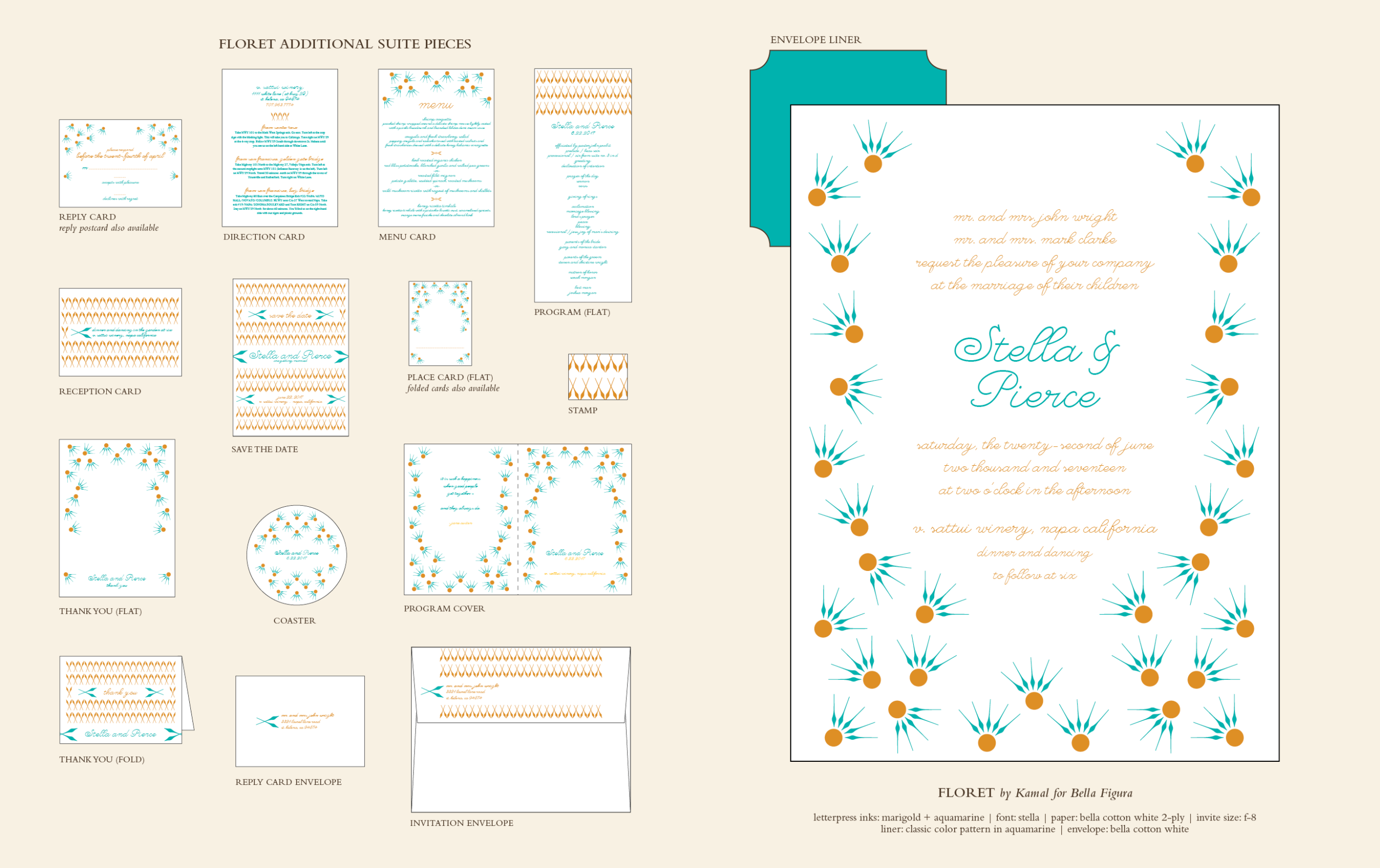 by Kamal Patel for Bella FiguraA simple elegance and whimsical type style lend Floret an understated and unique character in these letterpress invitations from designer Kamal Patel. Indie romance meets floral chic and makes for an eco-savy letterpress invite package.