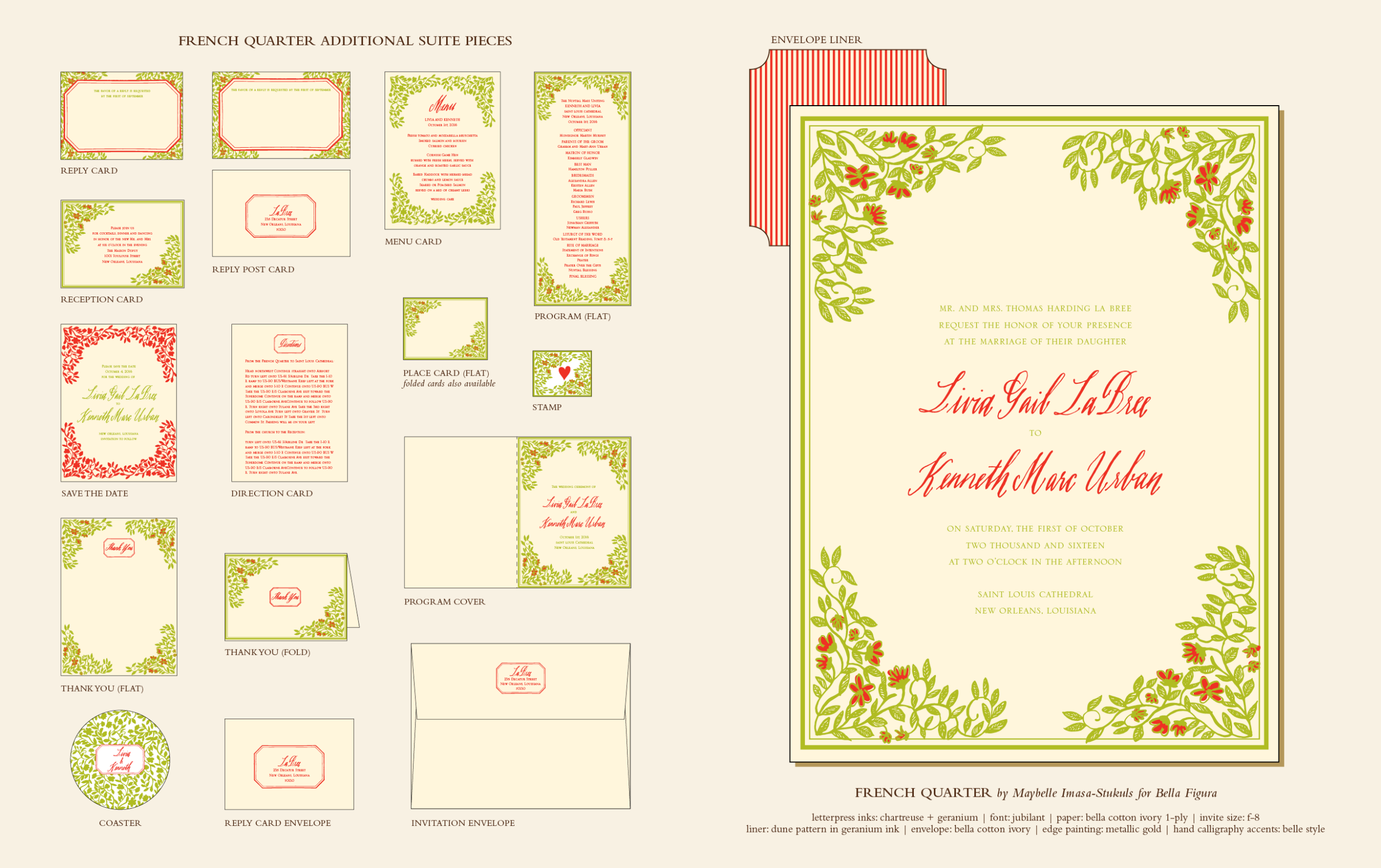 by Maybelle Imasa-Stukuls for Bella FiguraDesigned by Maybelle Imasa-Stukuls and brought to life on our cantankerously clattering cast iron presses, French Quarter is a delightfully sweet letterpress invitation with an inescapable hint of casual European panache. Wrapped in delicately penned blooms and featuring Maybelle's delightful hand calligraphy, this letterpress invitation is perfect for breezy spring or summer weddings — Parisian or otherwise.
