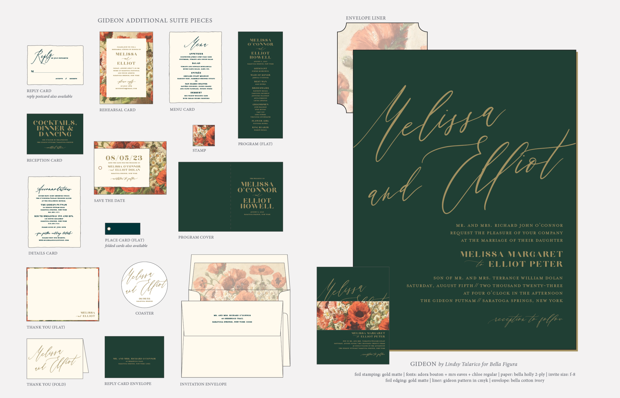 Retired Designs by Lindsy Talarico for Bella Figurafoil stamping: gold matte | fonts: adora bouton + mrs eaves + chloe regular| paper: bella holly (now evergreen) 2-ply | invite size: f-8 | foil edging: gold matte | liner: gideon pattern in cmyk | envelope: bella cotton ivory