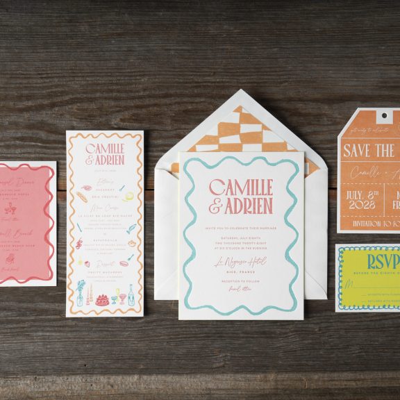 Wedding Invitations by Cassidy Hatch for Bella Figuraletterpress inks: watermelon + aquamarine | fonts: palmore + questrial + la luxes script | paper: bella smooth cotton white 2-ply | invite size: f-8 | edging painting: lime-aid | liner: gigi pattern in persimmon | envelope: bella cotton white pointed flap | digital addressing inks: cherry + aquamarine
