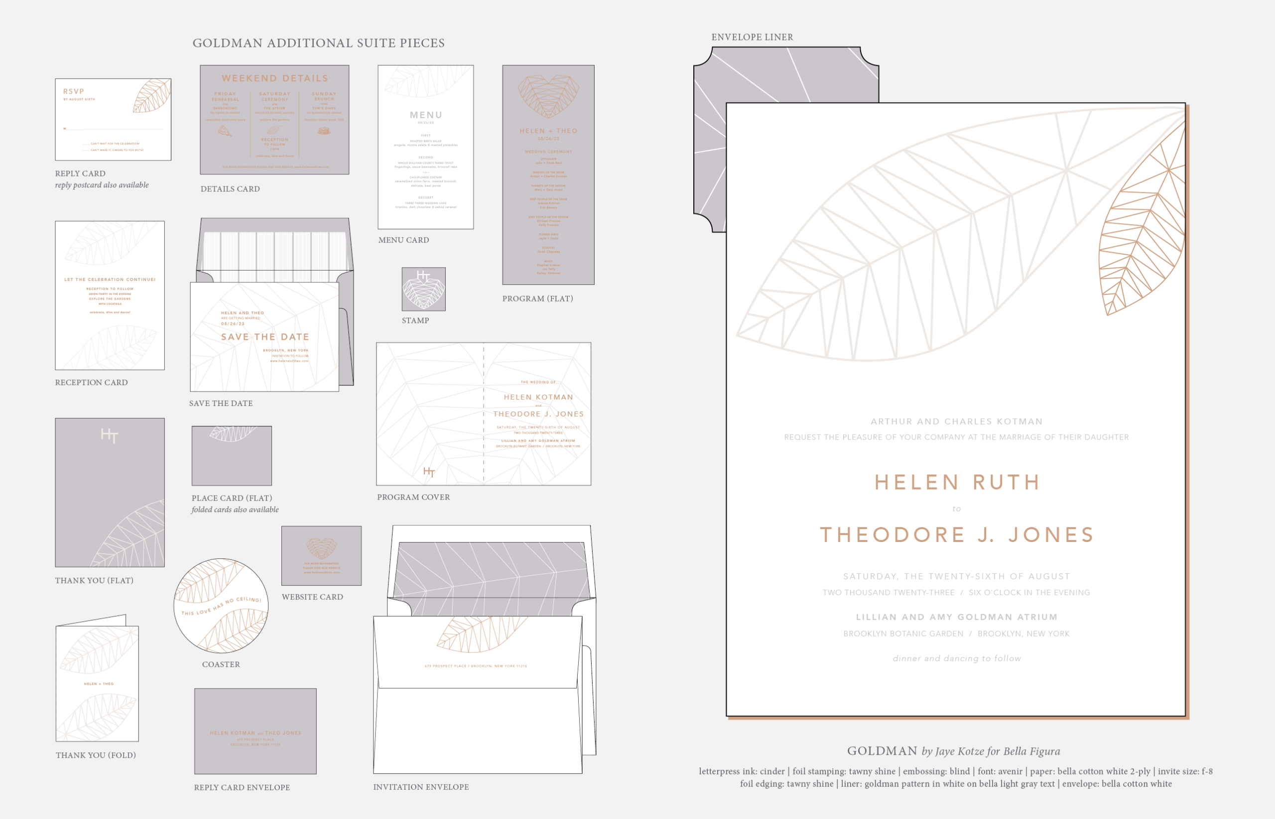 Wedding Invitations by Jaye Kotze for Bella Figuraletterpress ink: cinder | foil stamping: tawny shine | embossing: blind | font: avenir | paper: bella cotton white 2-ply | invite size: f-8 | foil edging: tawny shine | liner: goldman pattern in white on bella light gray (now pebble) text | envelope: bella cotton white