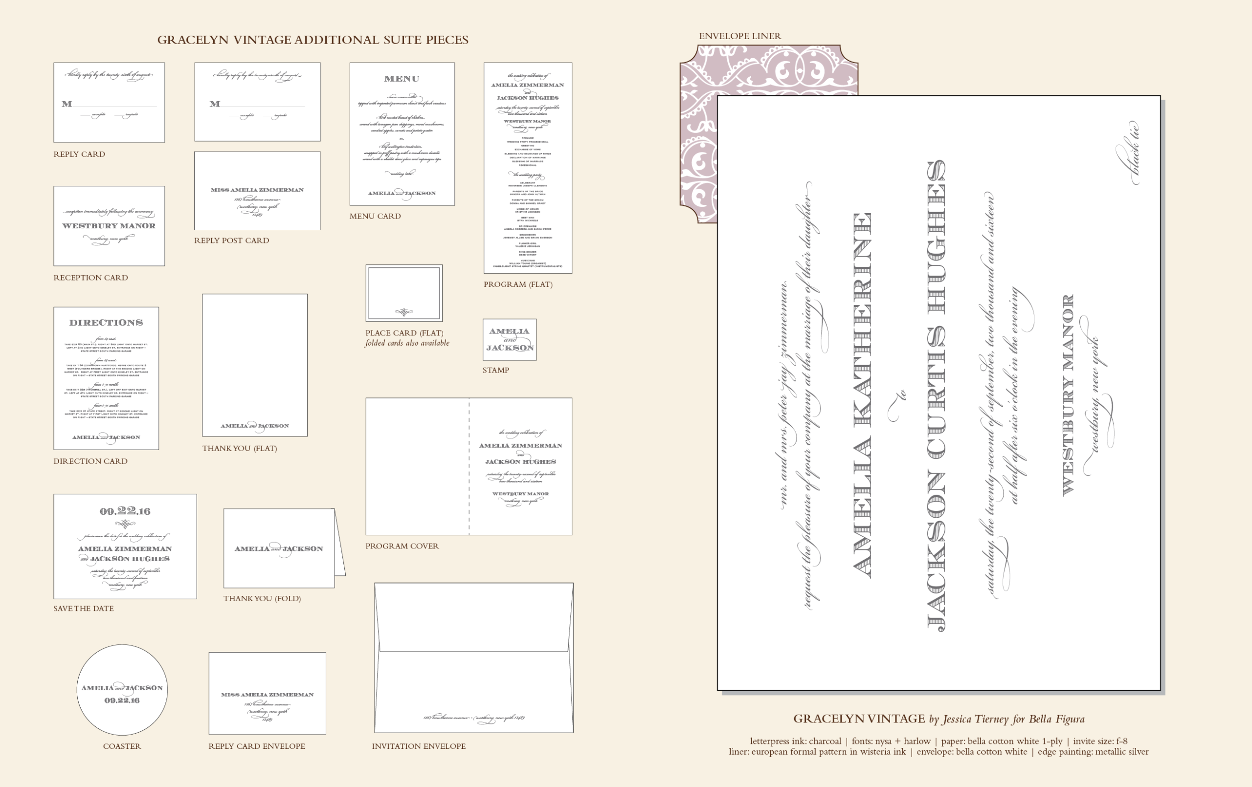 Wedding Invitations by Jessica Downs for Bella FiguraGracelyn Vintage is a fresh take on timeless and traditional wedding invitations for a wedding with classic style. This is an elegant letterpress wedding invitation with pretty script, simple lines and endless possibilities.