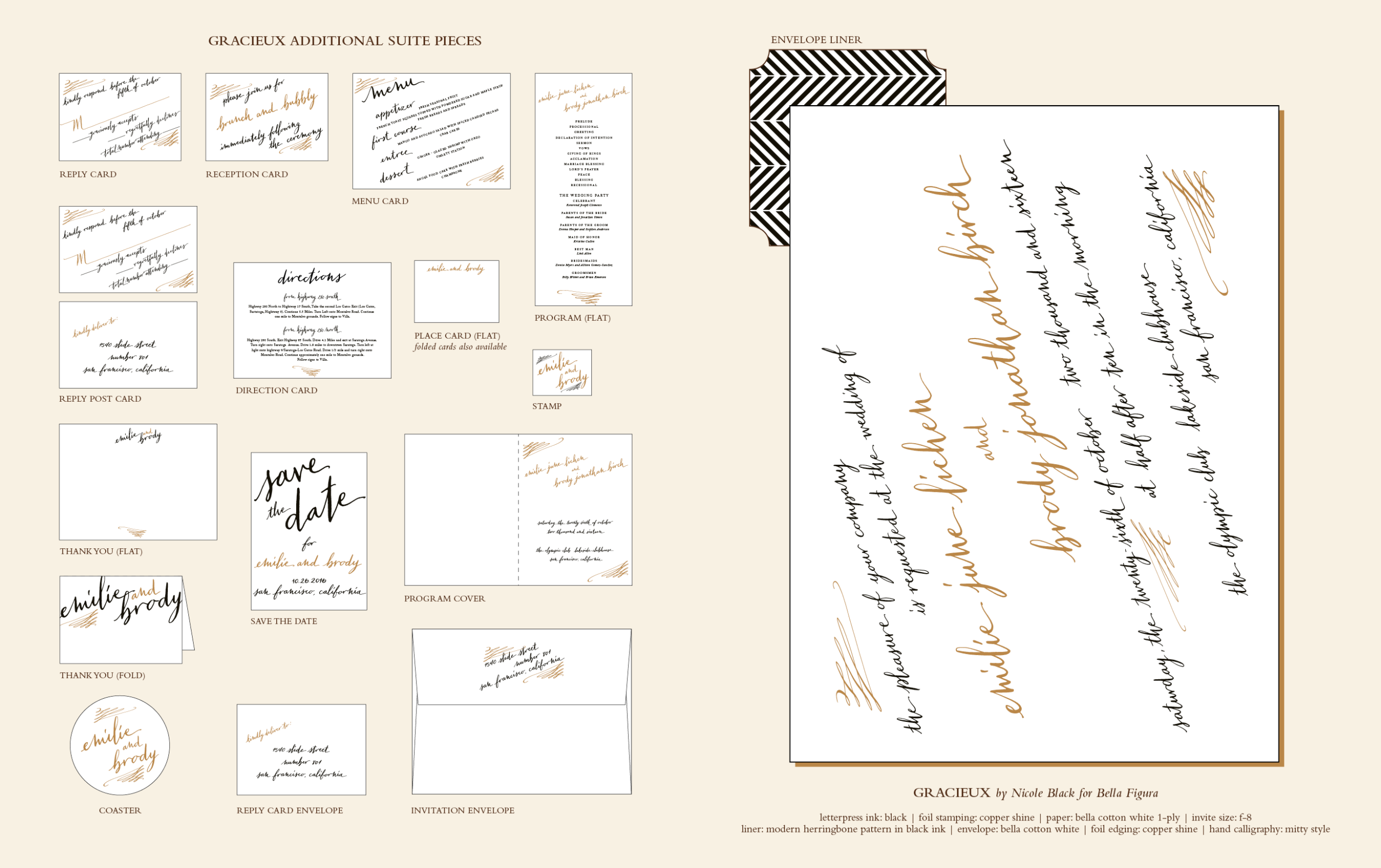 Wedding Invitations by Nicole Black for Bella FiguraA contemporary and unique letterpress invitation featuring the gorgeous hand calligraphy of Nicole Black, Gracieux wedding invitations speak passionately and with a flurried sense of urgency. These eco friendly wedding invitations are perfect for both traditional and modern weddings, with their classic letterpress printing and timeless calligraphy style.