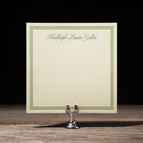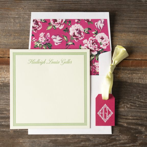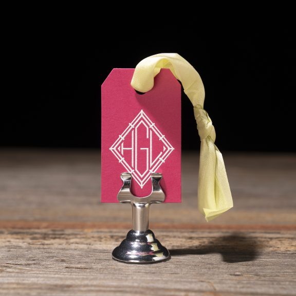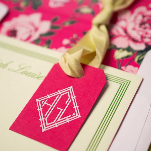 Social Stationery by Jessica Downs for Bella Figuraengraving ink: white | font: monogram diamond | paper: punch 1-ply | tag size: custom cut 1.5 x 2.5 (tier 1) | diecut style: cd-116 | silk ribbon: celery