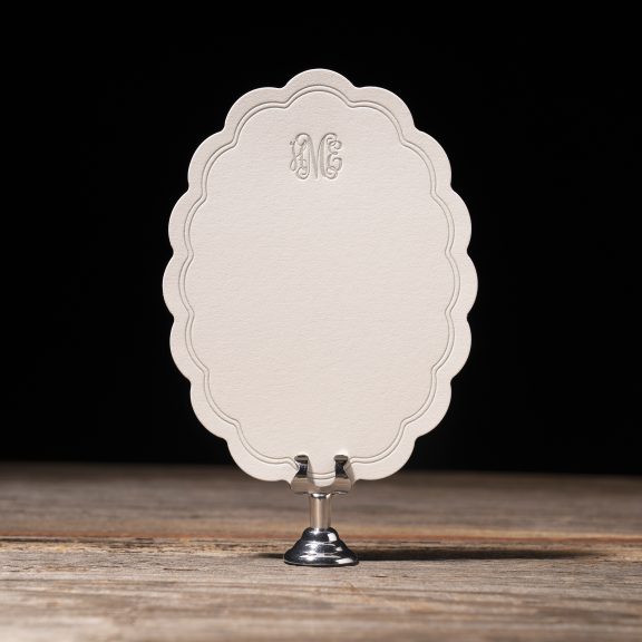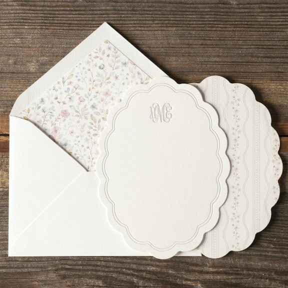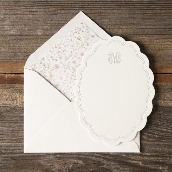 Social Stationery by Lindsy Talarico for Bella Figuraletterpress ink: mineral (front) | digital inks: mineral + cmyk (back) | fonts: vine monogram solid + adonis | paper: bella smooth cotton white 1-ply | card size: a-6 (tier 2) | diecut style: cd-558 | liner: hallie floral pattern in cmyk | envelope: bella cotton white pointed flap | digital addressing inks: mineral + cmyk