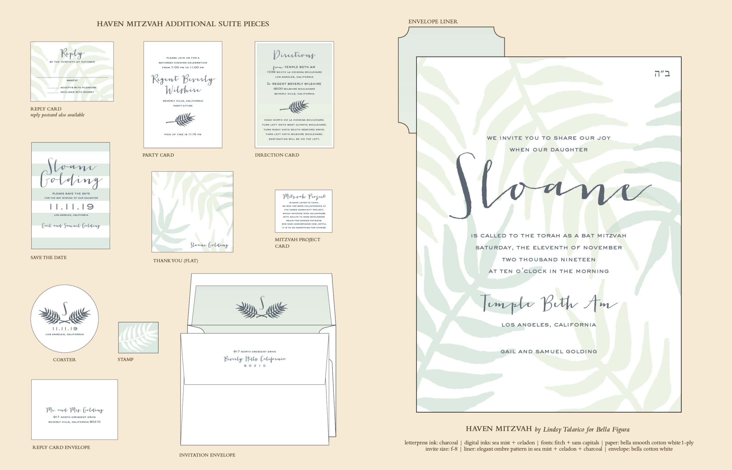 Mitzvah Invitations by Lindsy Talarico for Bella Figuraletterpress ink: charcoal | digital inks: sea mist + celadon | fonts: fitch + sans capitals | paper: bella smooth cotton white 1-ply | invite size: f-8 | liner: elegant ombre pattern in sea mist + celadon + charcoal | envelope: bella cotton white