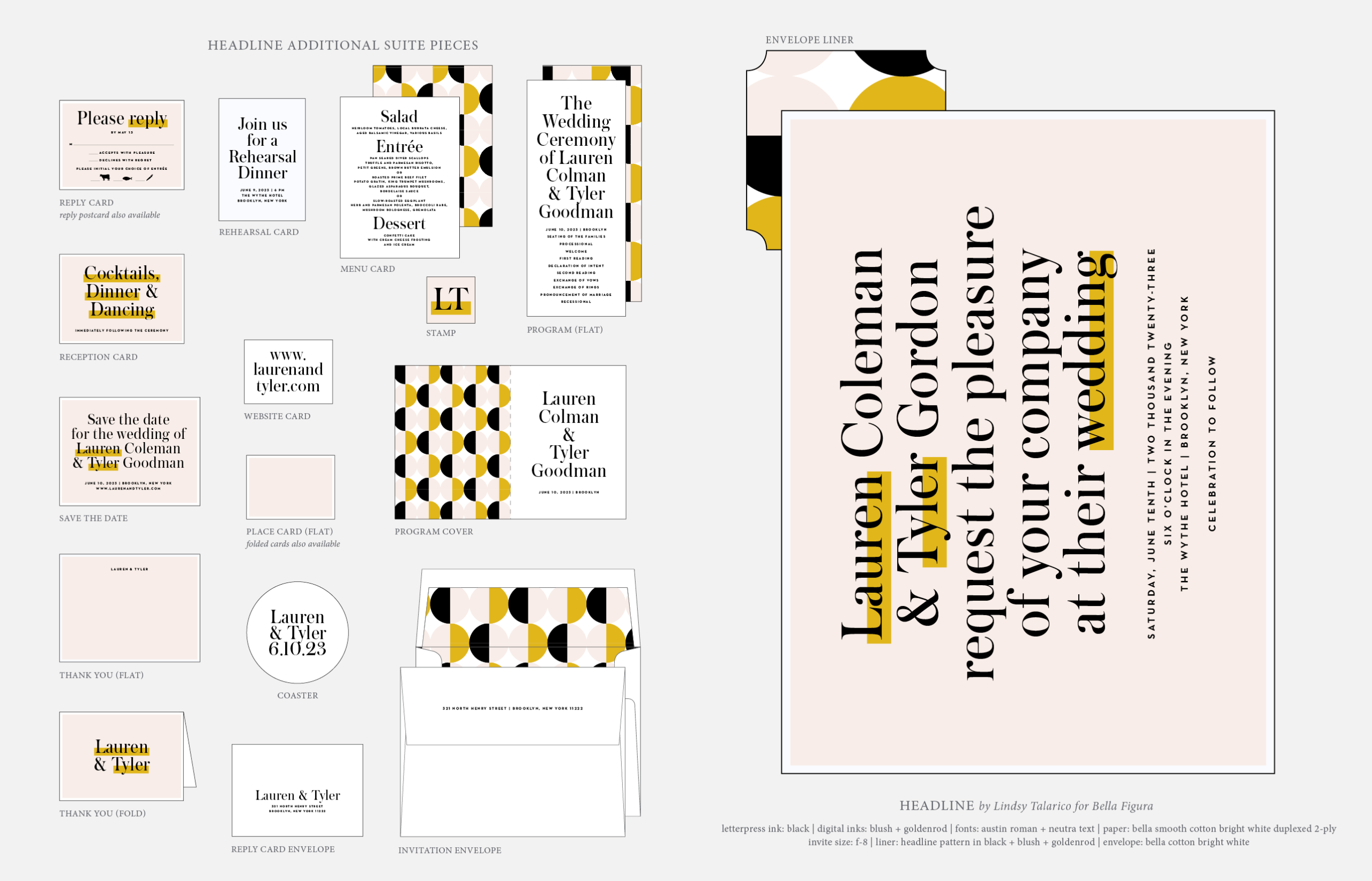 Retired Designs by Lindsy Talarico for Bella Figuraletterpress ink: black | digital inks: blush + goldenrod | fonts: austin roman + neutra text | paper: bella smooth cotton bright white duplexed 2-ply | invite size: f-8 | liner: headline pattern in black + blush + goldenrod | envelope: bella cotton bright white